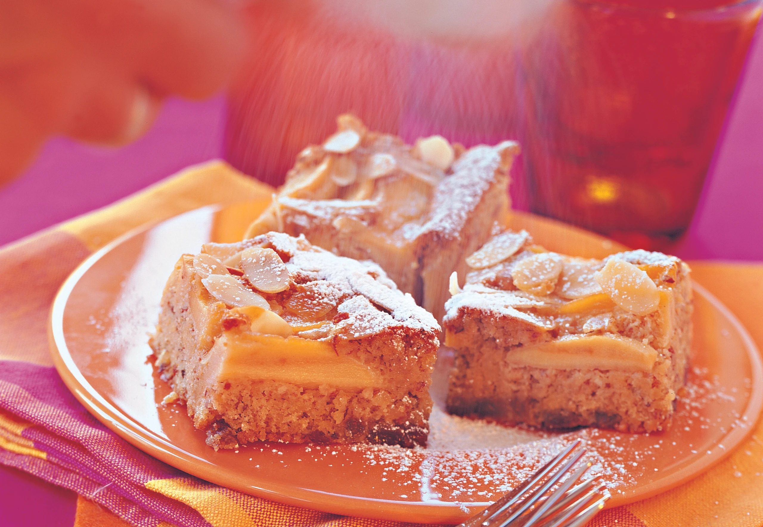 Masse auf das Backblech streichen, mit Apfelspalten belegen und mit Mandelblättchen bestreuen. Im Rohr ca. 40 Minuten backen.