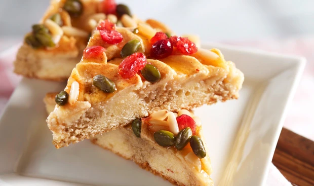 - Kuchen aus dem Rohr nehmen, mit Marmelade bestreichen, mit Pinienkernen, Pistazien und Cranberries bestreuen.