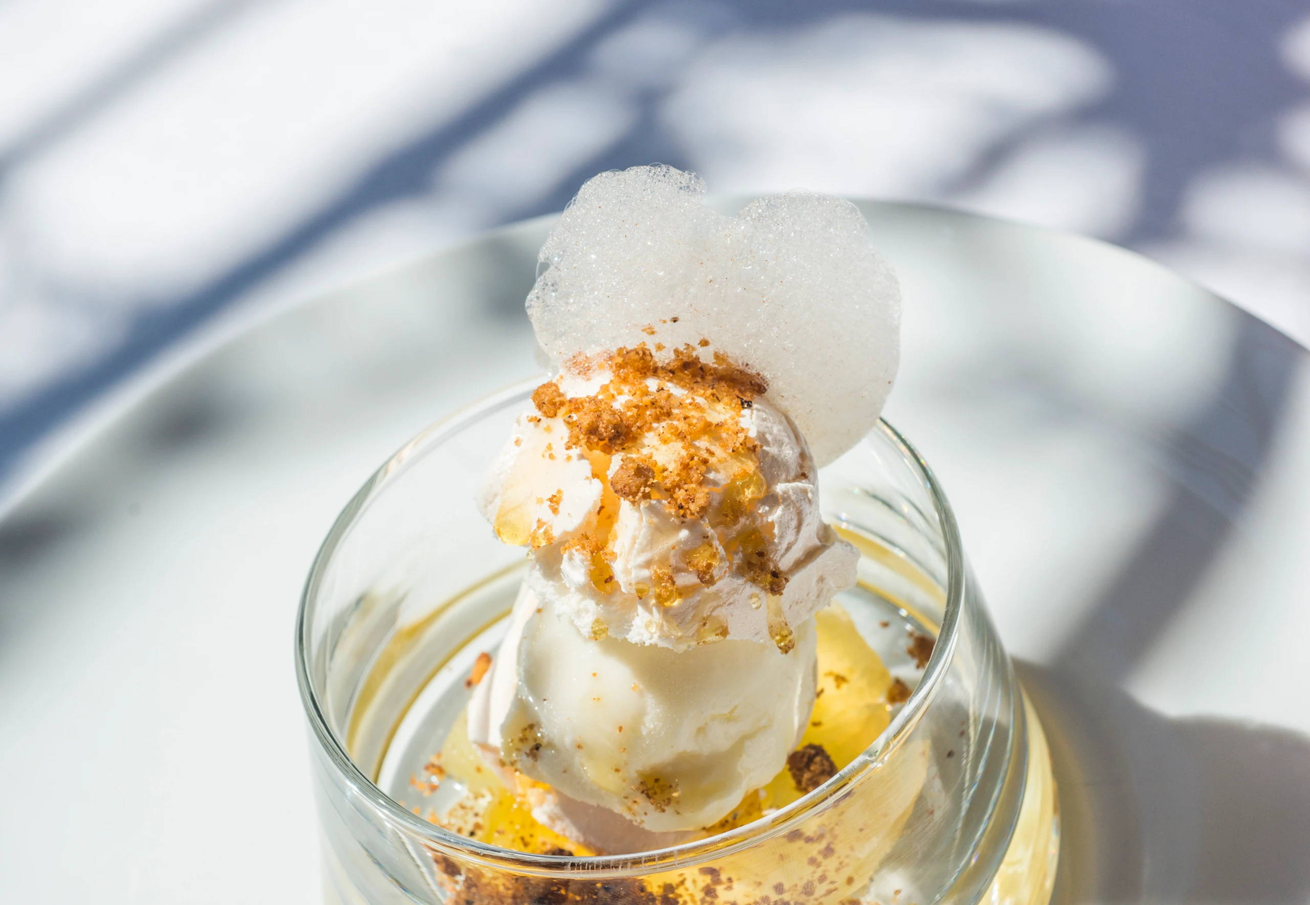Gusto-Tipp: Danijel Dekić setzt dem Dessert noch ein Schäumchen drauf. Dafür schlägt er Apfelsaft mit Lecithinpulver zu stabilem Schaum.