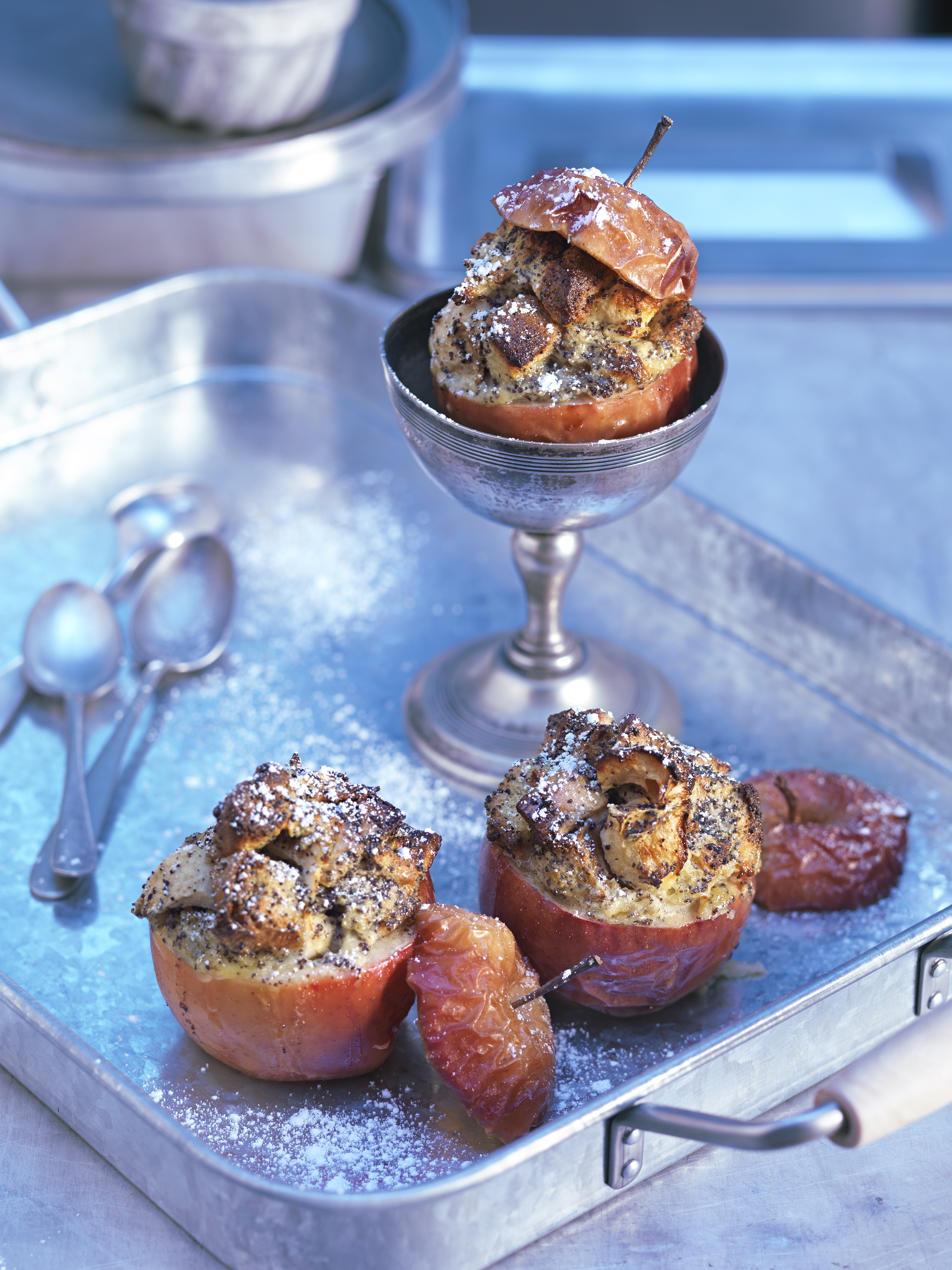 Für die Fülle Brioche-Zopf in ca. 1 cm große Stücke schneiden. Milch, Obers, Eier, Dotter, Zucker, Vanillezucker, Zitronenschale und Mohn gut verquirlen. Briochestücke, Apfelstücke und Überguss vermischen und in die Äpfel füllen.