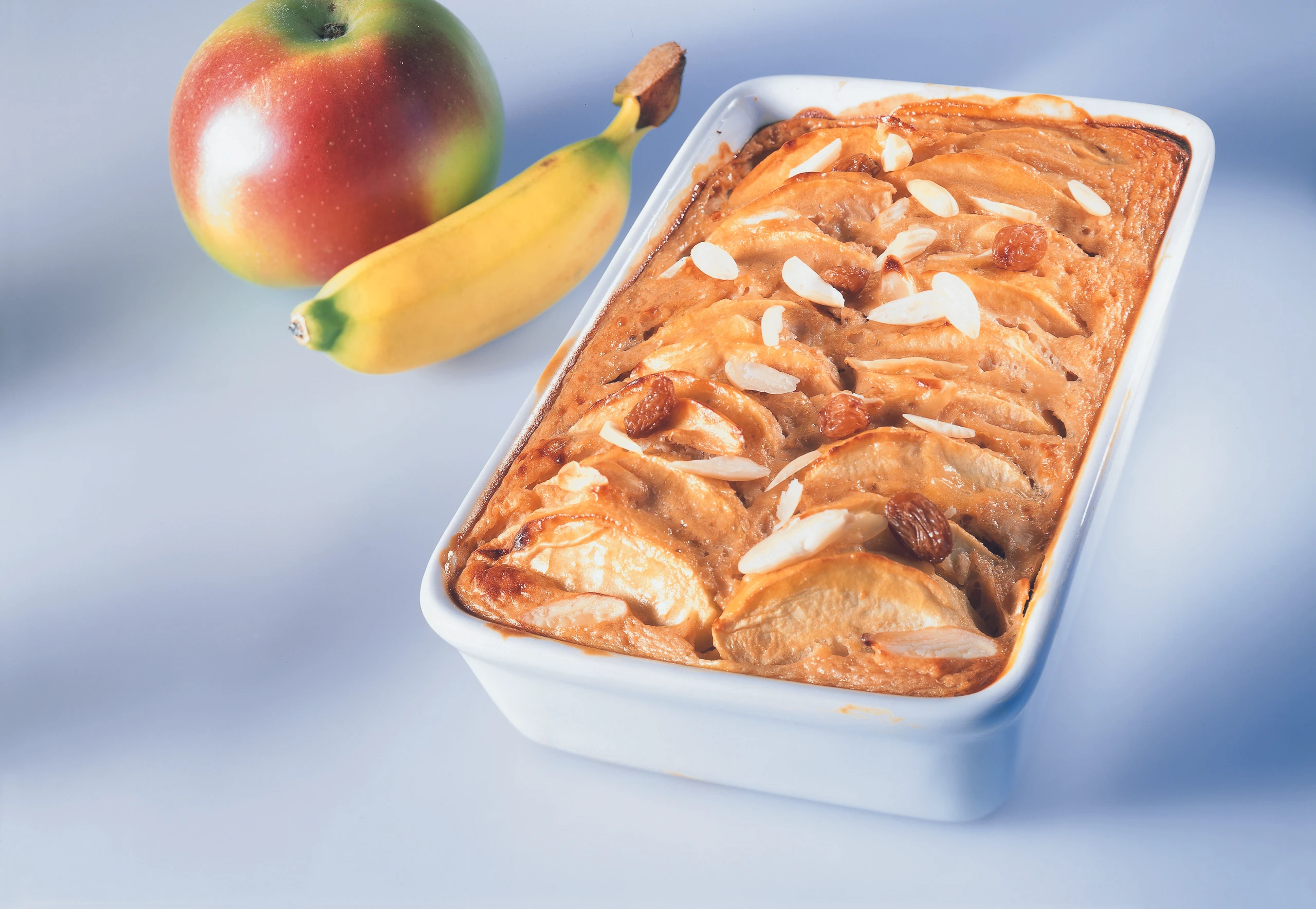 Äpfel schälen, halbieren und entkernen. Äpfel in schmale Spalten schneiden, in eine Auflaufform schichten, mit Zucker bestreuen, mit Calvados oder Rum beträufeln und mit der Bananencreme übergießen.