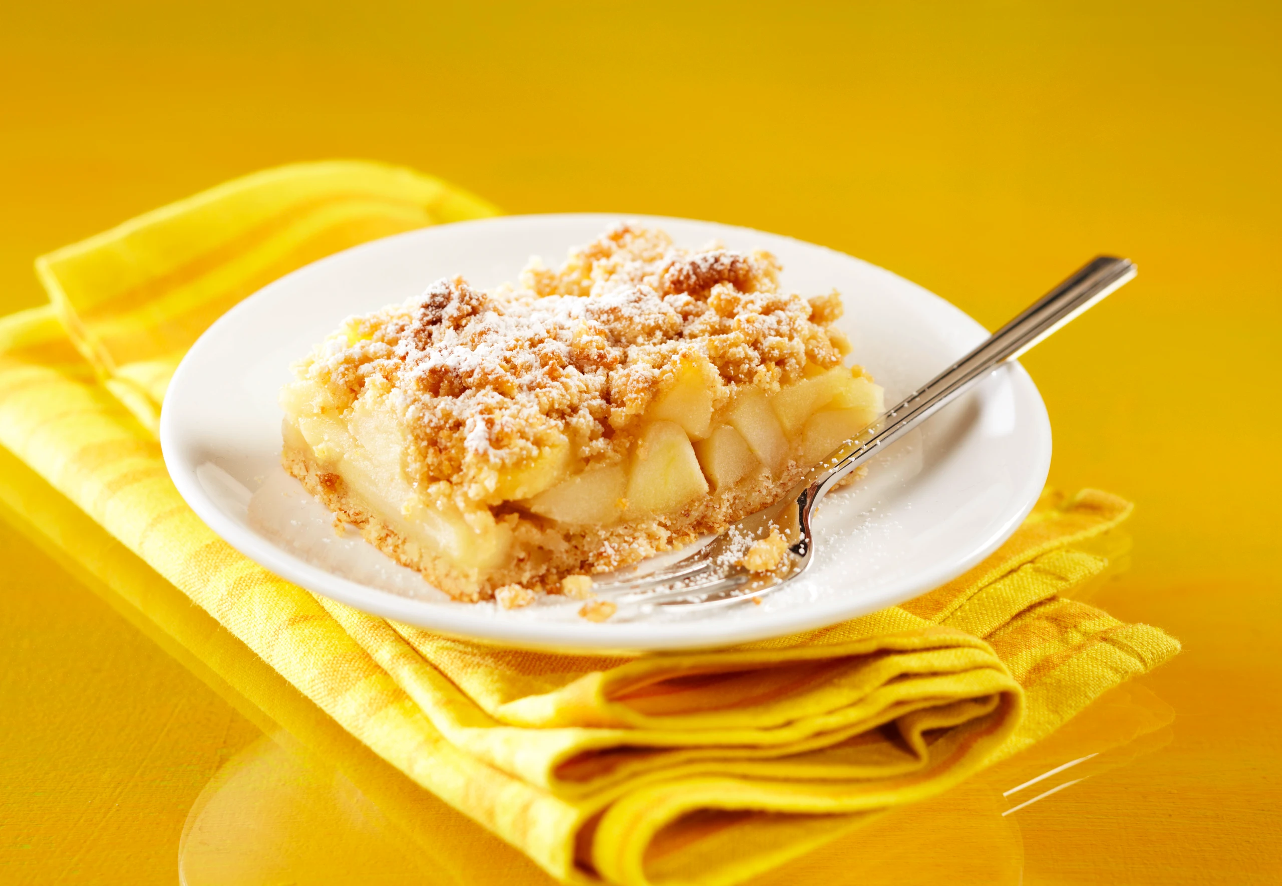 Apfelspalten gleichmäßig auf dem Teigboden verteilen. Streusel grob über die Äpfel raspeln. Kuchen im Rohr ca. 20 Minuten backen. Vor dem Anrichten Kuchen eventuell mit Staub-zucker bestreuen.