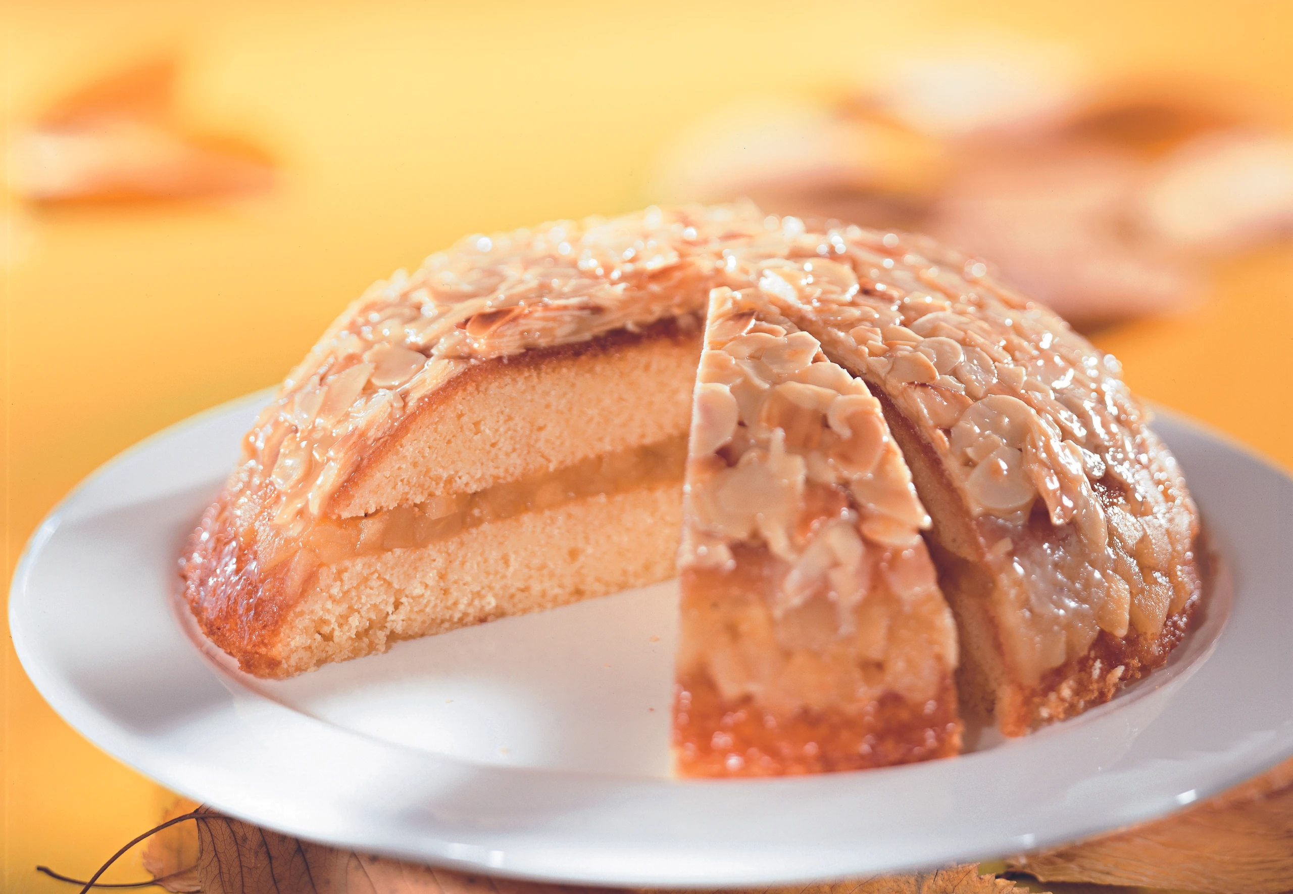 Form kalt ausspülen und mit Frischhaltefolie auslegen. Kuchen horizontal durchschneiden, einen Boden in die Form legen, mit 1 EL Marmelade bestreichen, Apfelmasse darauf verteilen. Schnittfläche des zweiten Bodens mit 1 EL Marmelade bestreichen und darauf legen. Torte mit Frischhaltefolie zudecken und für ca. 5 Stunden kühl stellen.