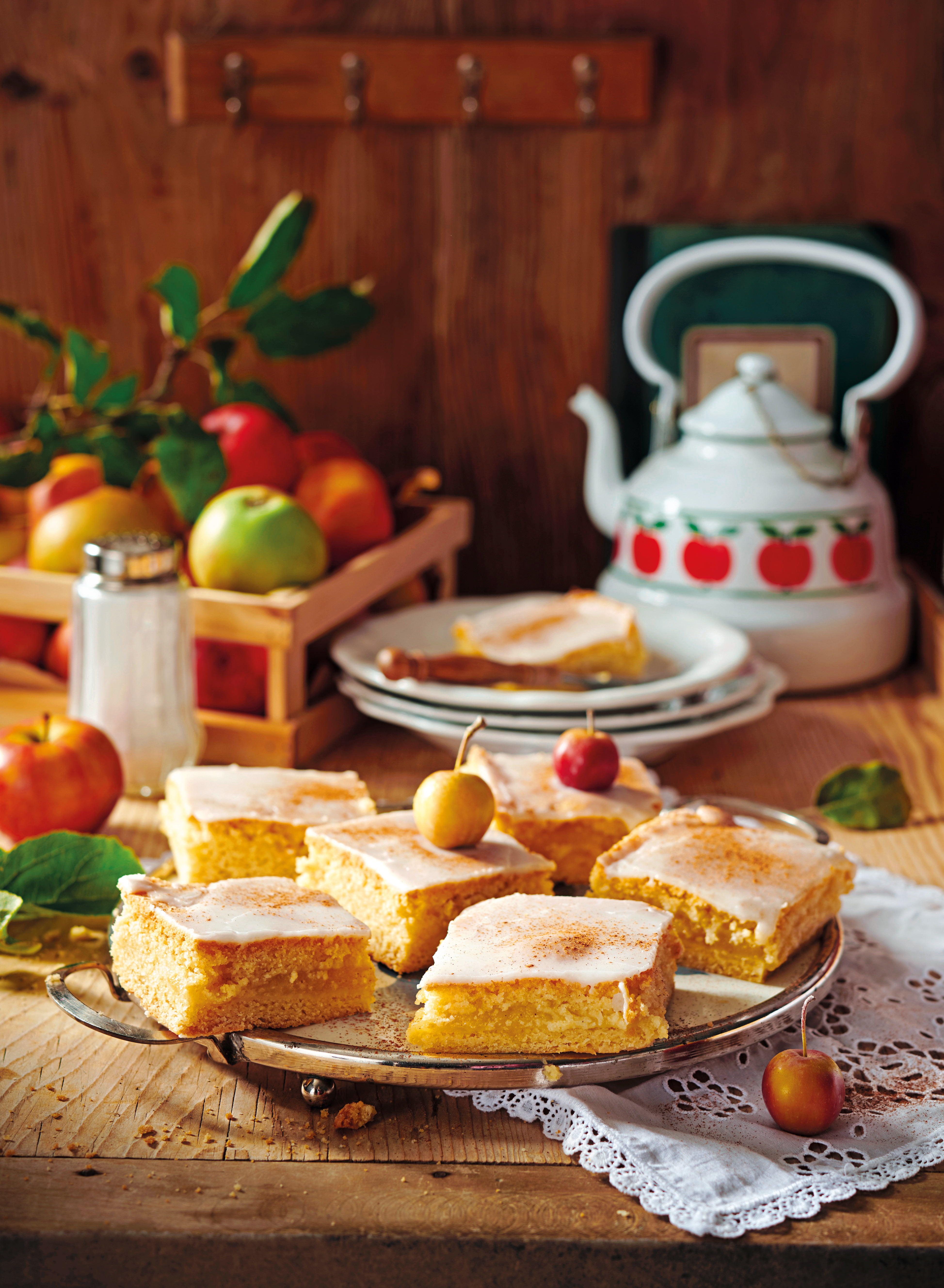 Für den Zuckerguss Staubzucker, Zitronensaft und Vanillemark glatt verrühren. Guss auf dem Kuchen verstreichen. Kuchen portionieren und mit Zimt bestreut servieren.