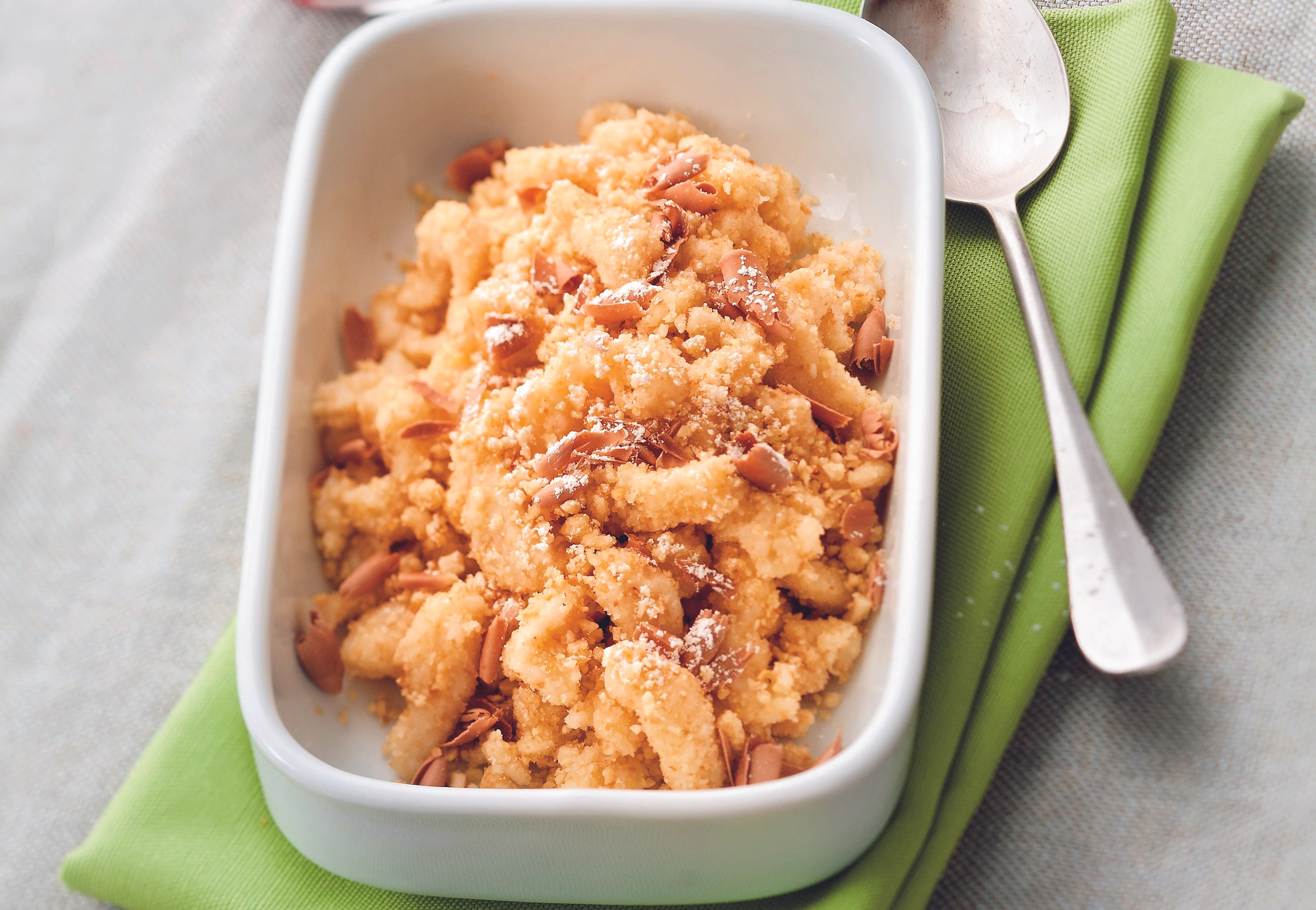 Mandeln mit Bröseln und Staubzucker mischen und unter Rühren in Butter anschwitzen. Nockerl zugeben und behutsam durchmischen. Nockerl anrichten, mit Schokolade und Staubzucker bestreut servieren. Dazu passt Himbeersauce.