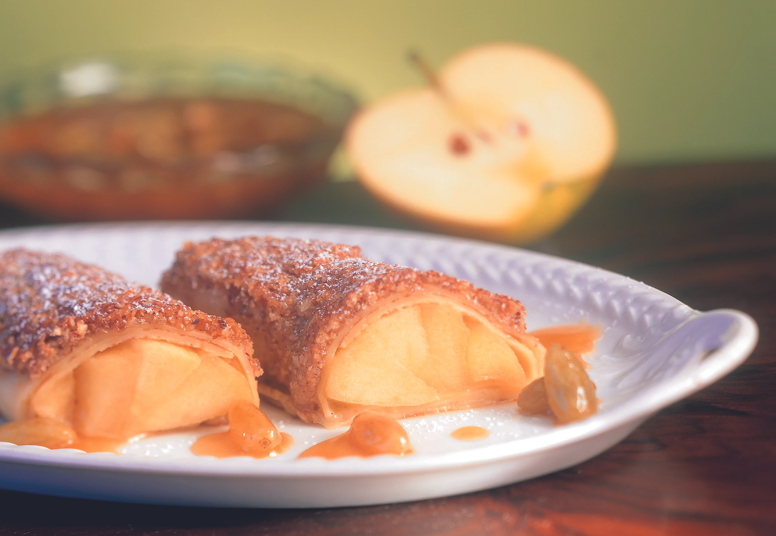 Apfel-Palatschinken mit Nusskruste und Karamell-Rosinen