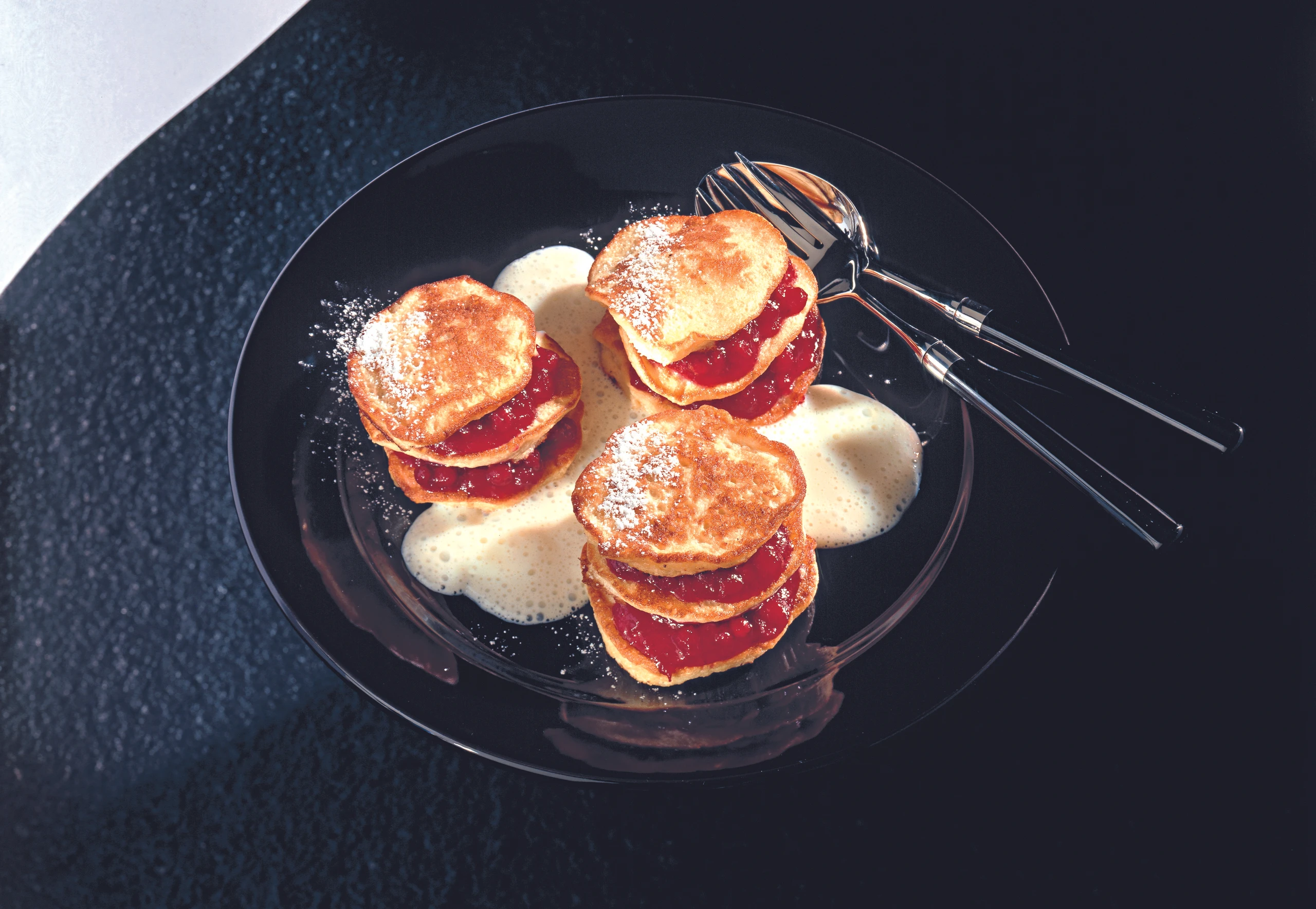 - Zwölf Apfelplätzchen mit Preiselbeerkompott bestreichen, Jeweils zwei Plätzchen übereinandersetzen und mit einem leeren Plätzchen bedecken. Apfelplätzchen mit Staubzucker bestreut servieren.