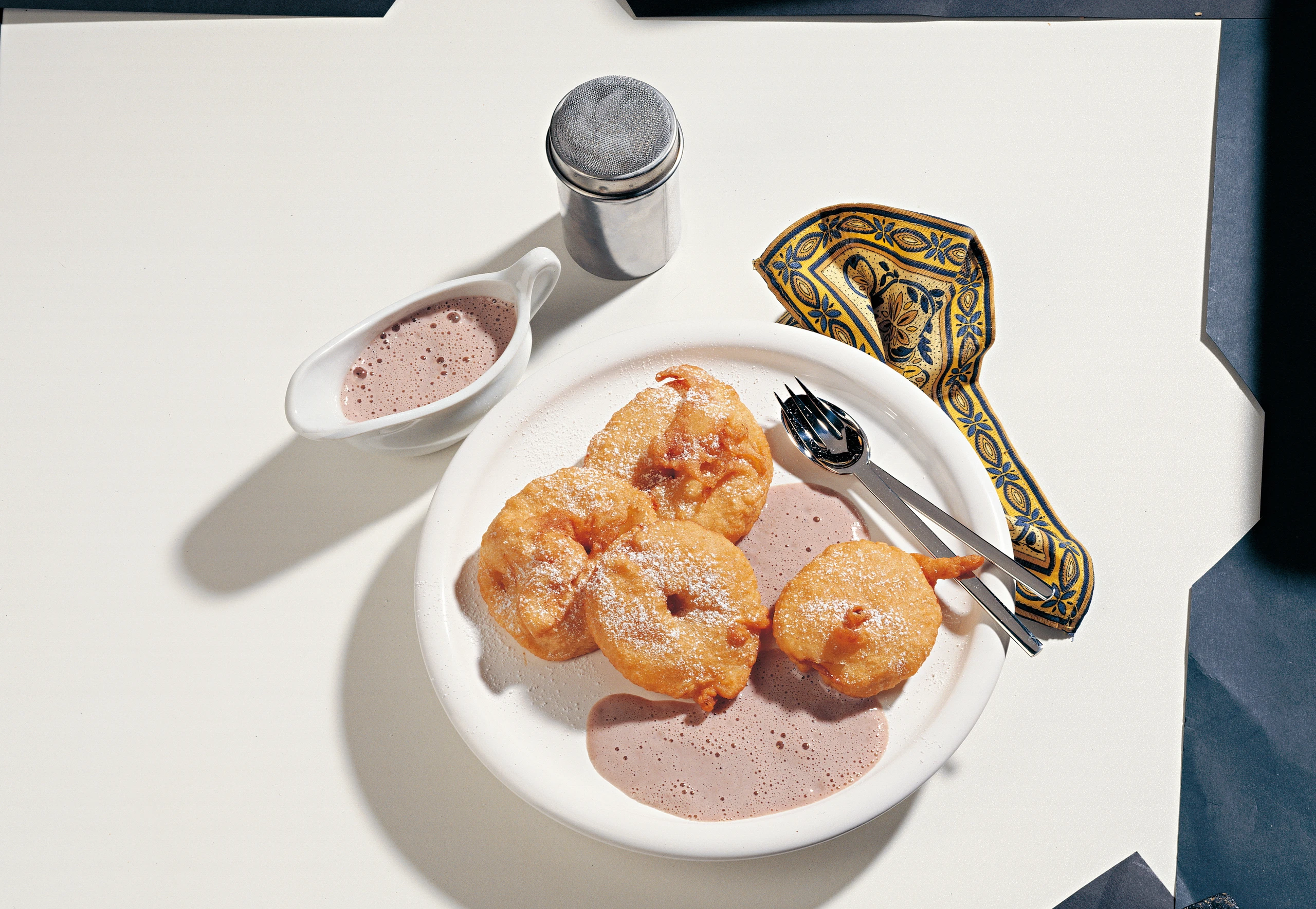 Eier in Dotter und Klar trennen. Mehl, Wein, Dotter, Zucker, abgeriebene Zitronenschale und 1 Prise Salz zu einem glatten Teig rühren. Eiklar zu cremigem Schnee schlagen und behutsam unter die Masse heben. Teig rasten lassen.