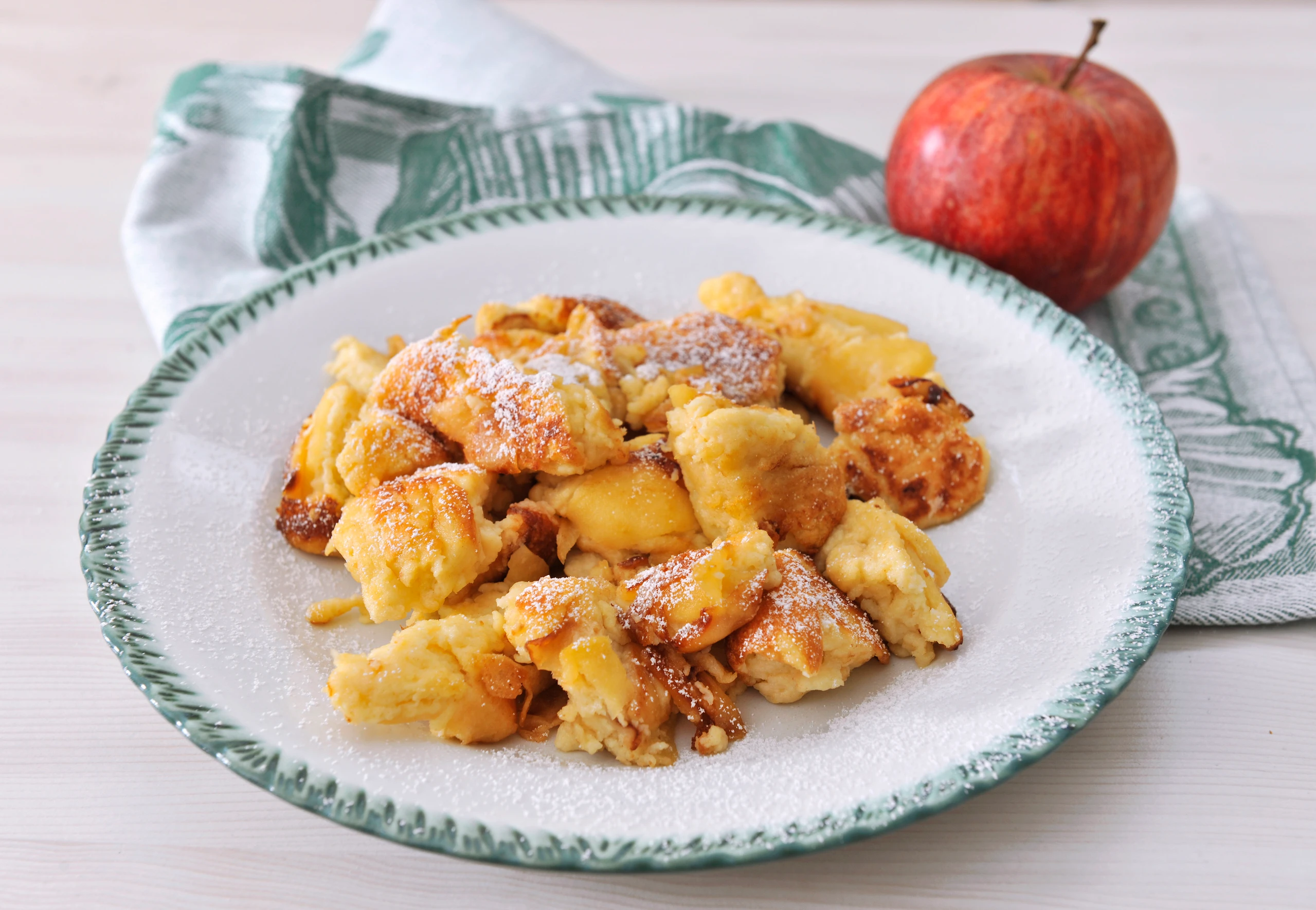 Teig in die Pfanne gießen. Schmarrn bei schwacher Hitze auf einer Seite goldbraun braten. Schmarrn in Stücke teilen, wenden und auf der anderen Seite goldbraun braten. Apfelschmarrn zerteilen und mit Staubzucker bestreuen.
