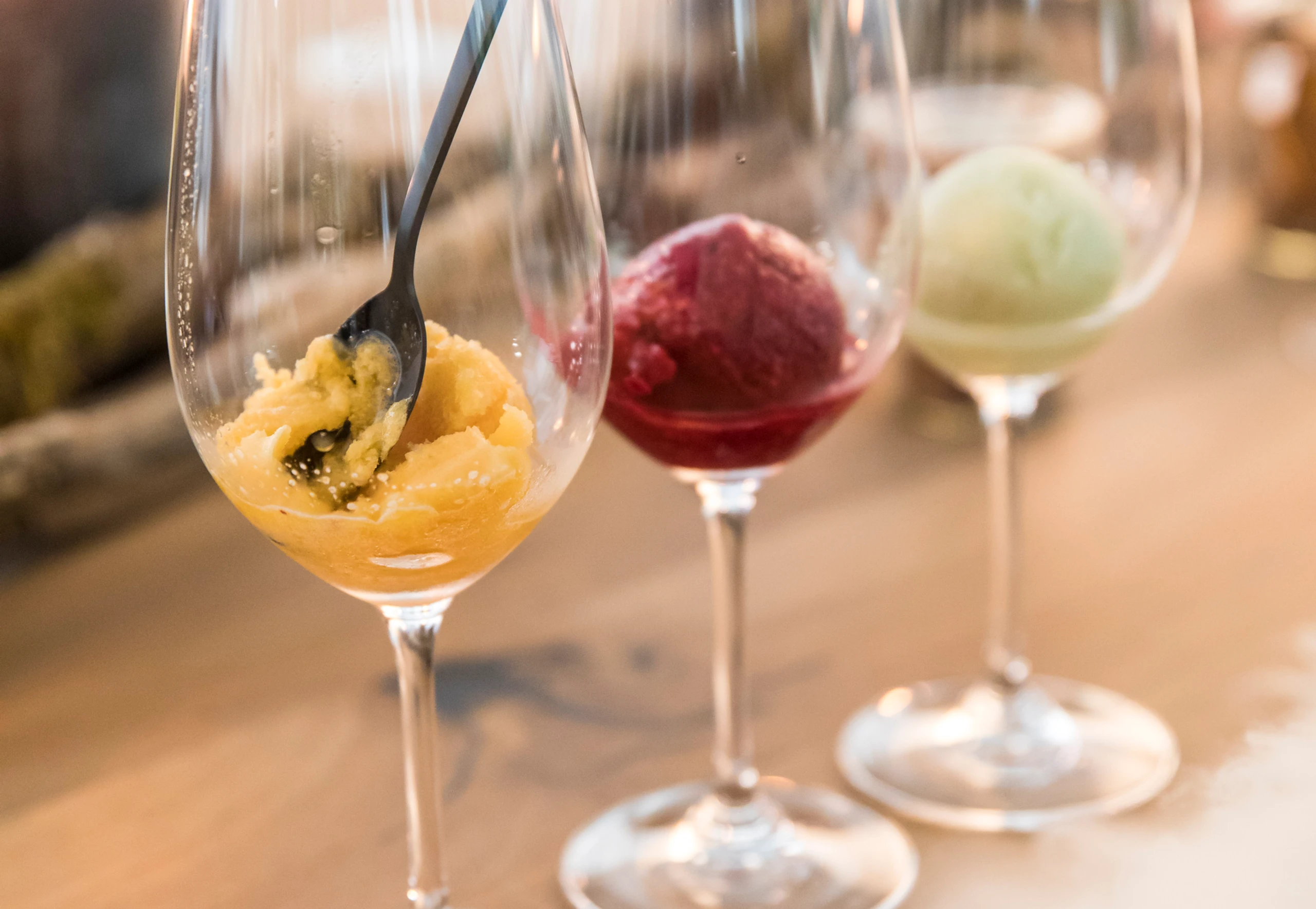 Sorbet in der Eismaschine cremig rühren und anrichten.