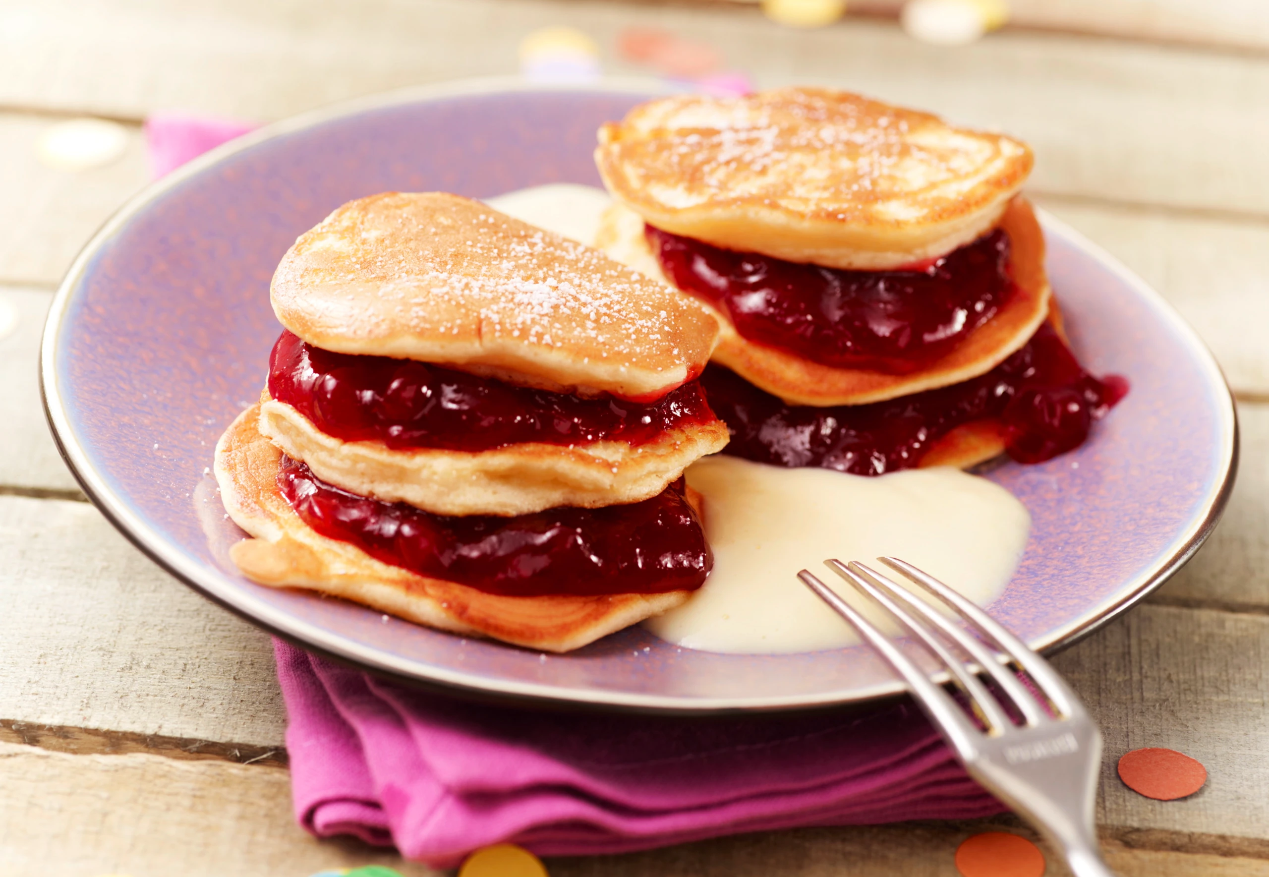 - Zwölf Apfeltaler mit Kompott bestreichen, je 2 übereinandersetzen und mit einem leeren Taler bedecken. Taler mit Staubzucker bestreut servieren. Dazu passt Vanillesauce mit Rum verfeinert.