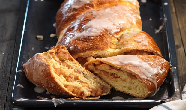 Teig durchkneten und halbieren. Teighälften auf einer bemehlten Arbeitsfläche ausrollen (20 x 10 cm). Fülle auf den Teighälften verteilen; dabei an den Rändern rundum 3 cm frei lassen. Teigstücke einrollen, zu einem Zopf flechten und zugedeckt ca. 30 Minuten aufgehen lassen.
