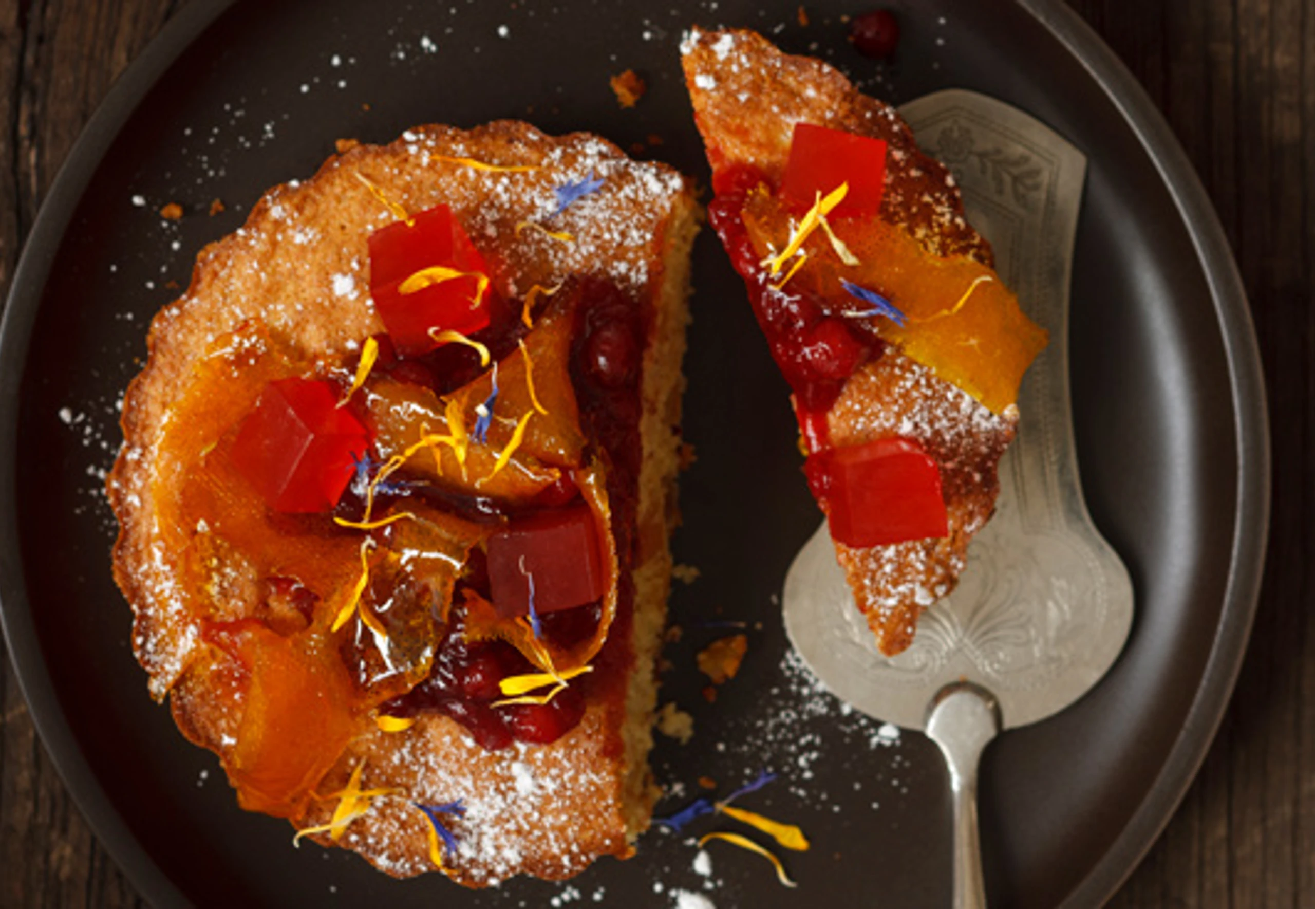 Gelee in Würfel schneiden. Kuchen aus den Förmchen stürzen und abkühlen lassen. Kuchen mit Preiselbeeren, Gelee und Orangenschalen garniert servieren. Eventuell mit Blüten bestreuen.