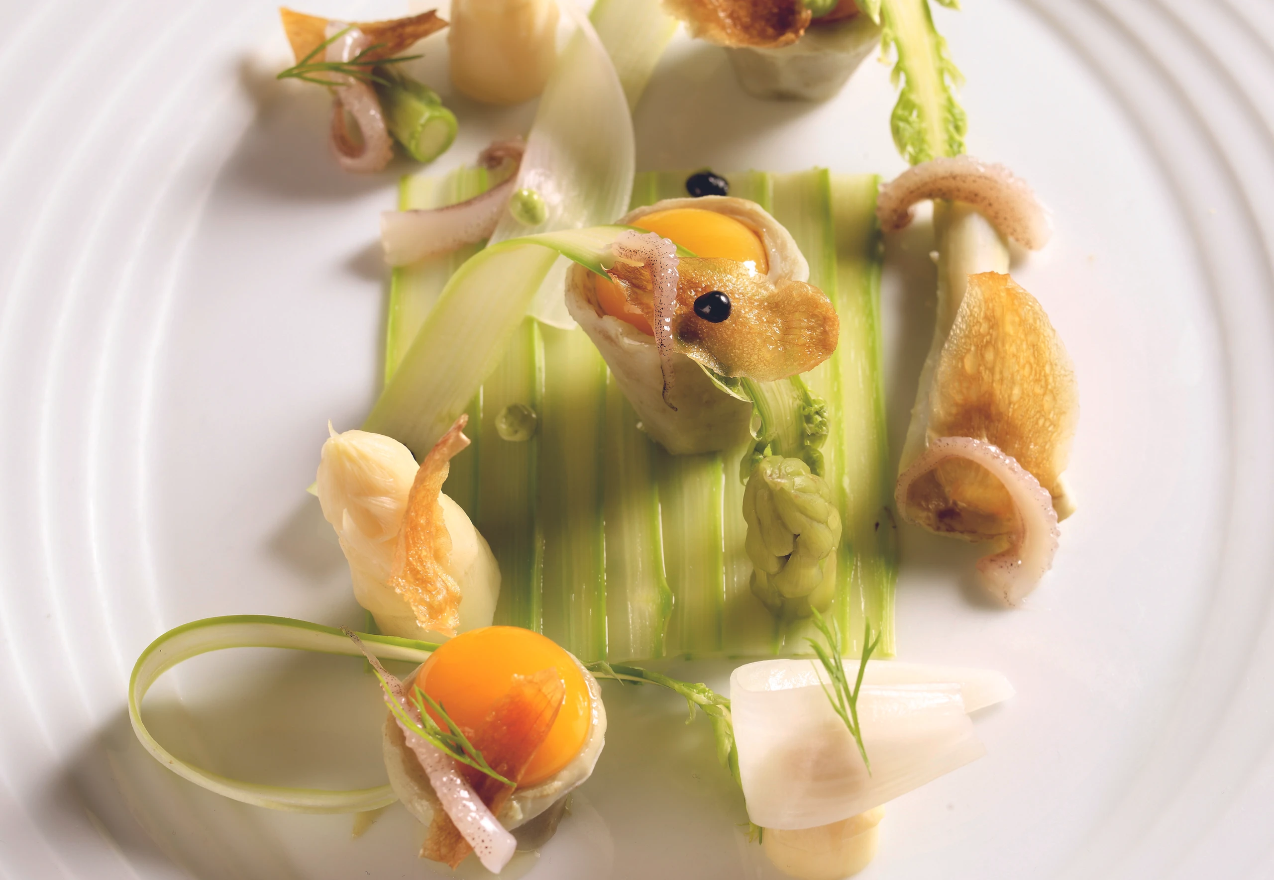 Vinaigrette: Distelöl, Apfelessig, 10 ml Weißweinessig, 80 ml Gemüsefond und 1 TL Dijon-Senf aufkochen und auskühlen lassen. Mit dem Spargelfond vermischen.