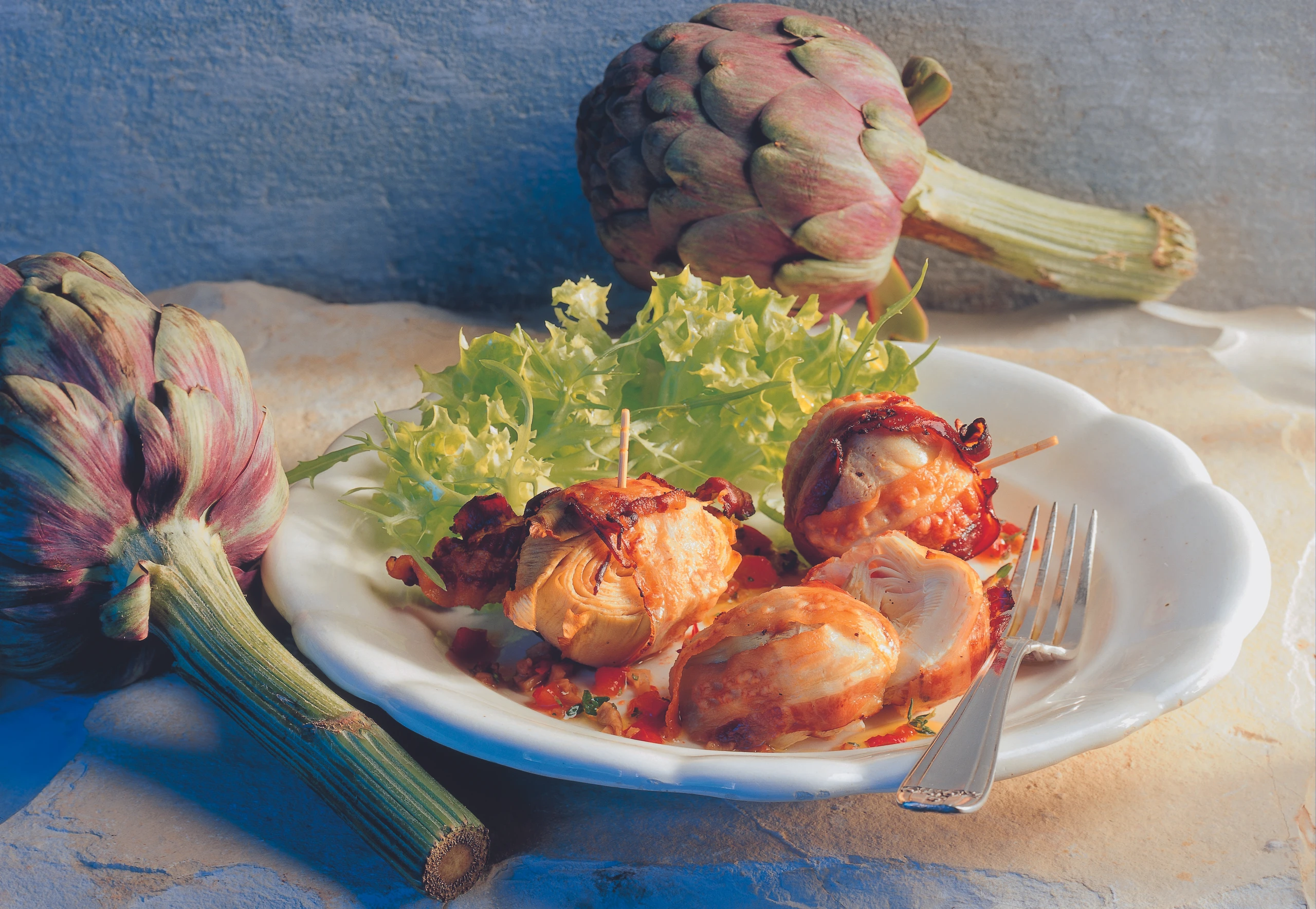 Artischockenherzen mit Küchenpapier gut trocken tupfen und mit je 2 Speckscheiben umwickeln, Speck mit Zahnstochern fixieren.
