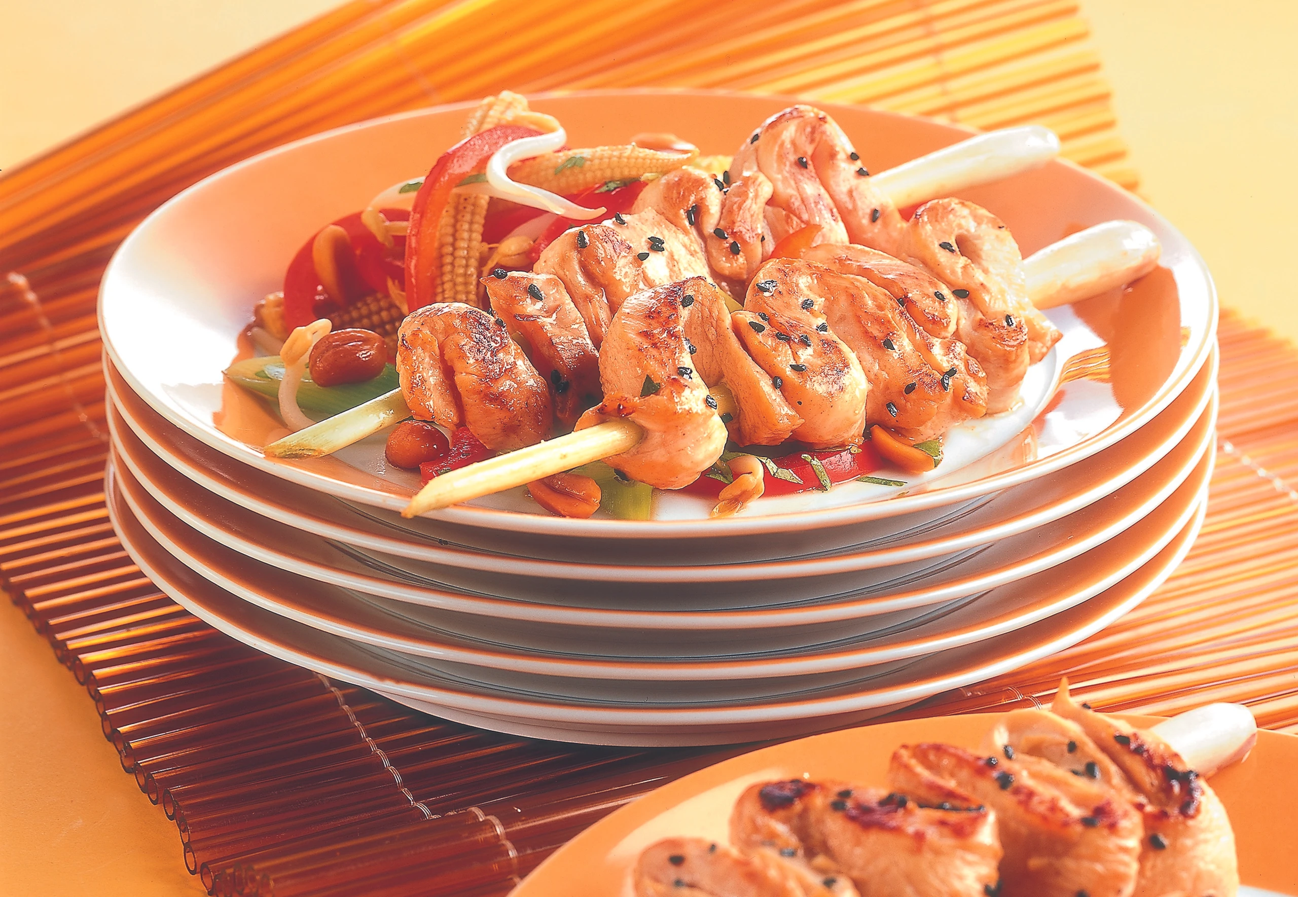 Asia-Hühnerspieße mit Pfannen-Gemüse