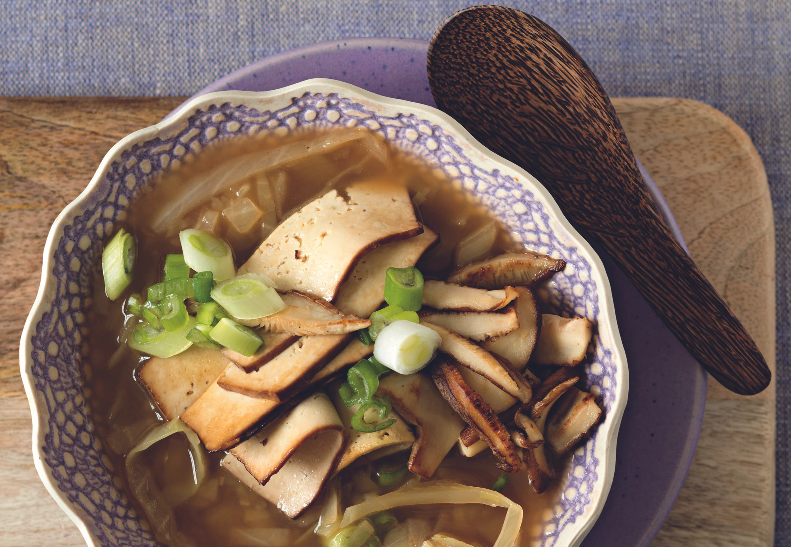 Für die Einlage Jungzwiebeln putzen und quer in Ringe schneiden. Tofu in dünne Scheiben schneiden. Jungzwiebeln und Tofu in die Suppe rühren und erhitzen. Suppe anrichten.