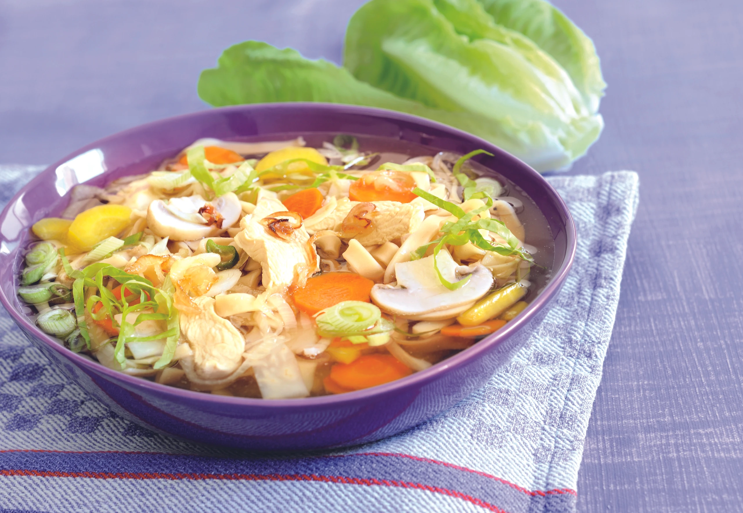 Suppennudeln bissfest kochen, abgießen, abtropfen lassen und in Schüsseln verteilen. Champignons, Gemüse und Fleisch darauf anrichten, mit Suppe auffüllen, mit Jungzwiebeln und Salatstreifen bestreut servieren.