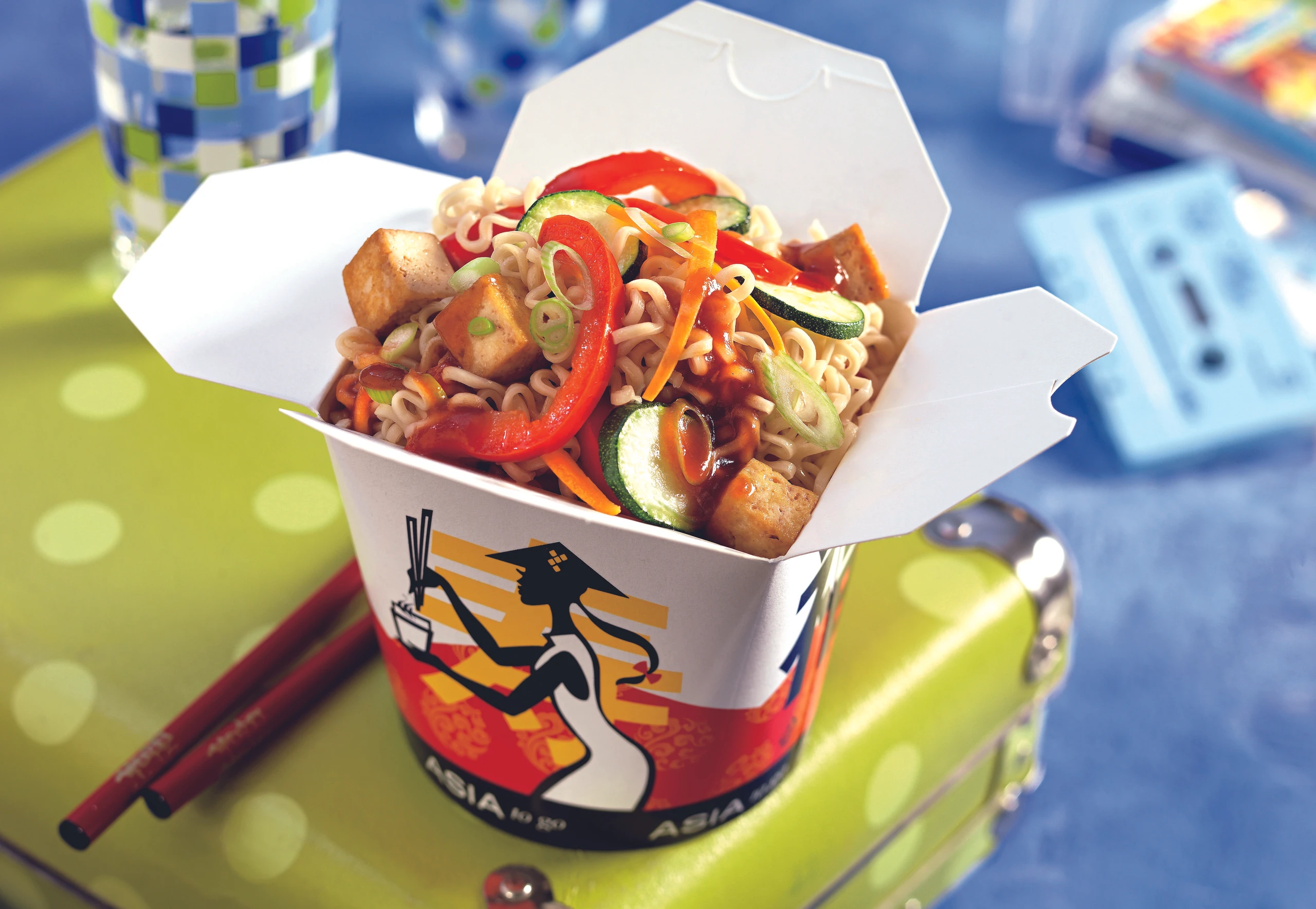 In einer beschichteten Pfanne oder im Wok restliches Öl erhitzen. Knoblauch, Paprika und Karotten darin unter Rühren 3 Minuten braten. Zucchini untermischen, leicht salzen. Alles unter Rühren 2 Minuten braten. Tofu unterrühren, kurz erhitzen.