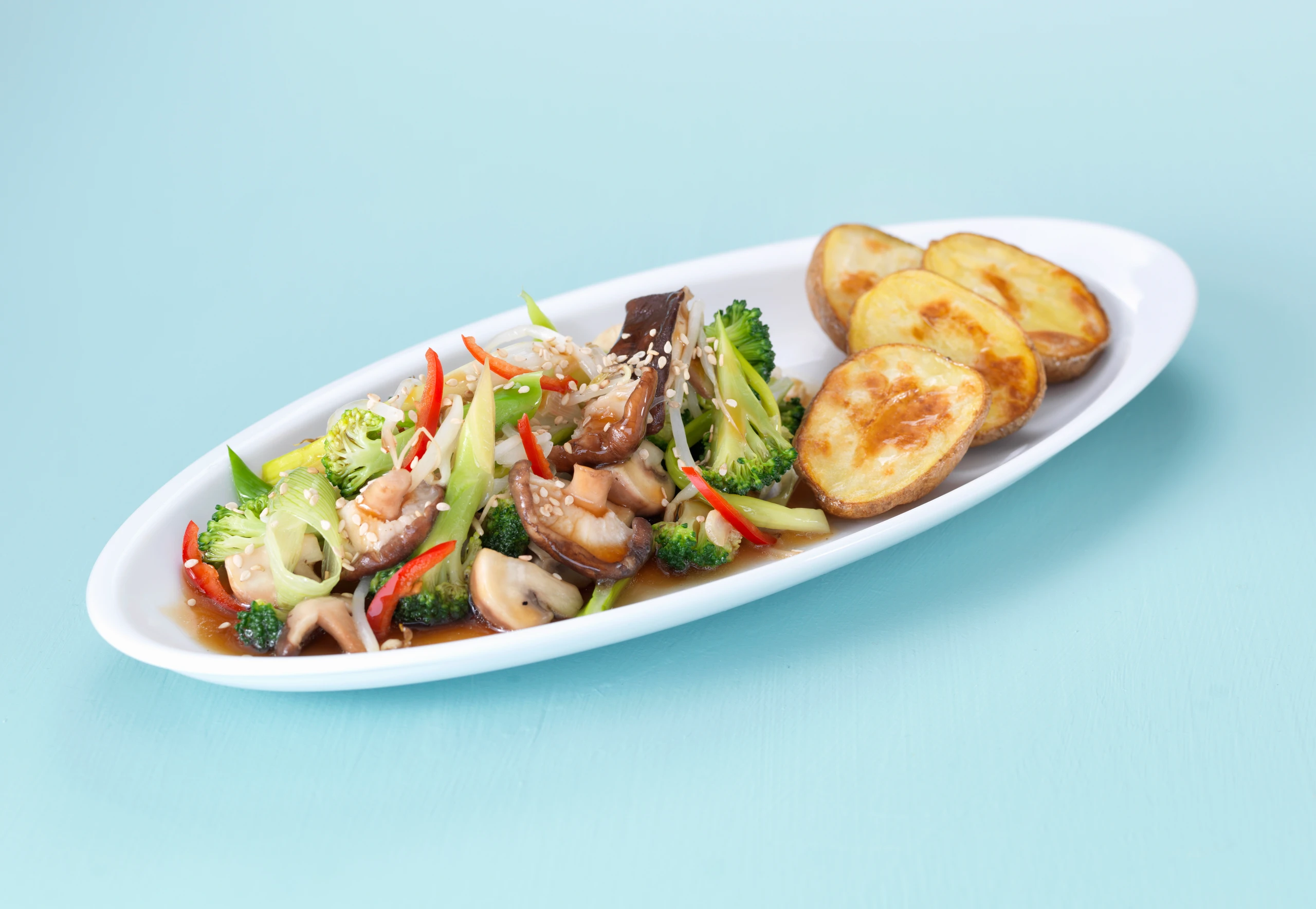 Asia-Pilz-Gemüse mit Ofen-Erdäpfeln
