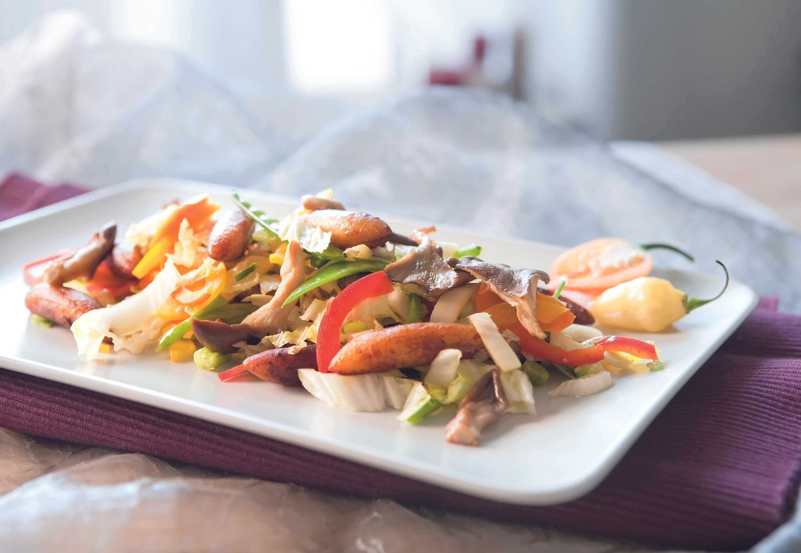 Gemüse putzen. Karotten in dünne Scheiben, Paprika, Erbsenschoten und Chinakohl in Streifen schneiden. Jungzwiebeln in Ringe schneiden. Pilze in grobe Stücke reißen.
