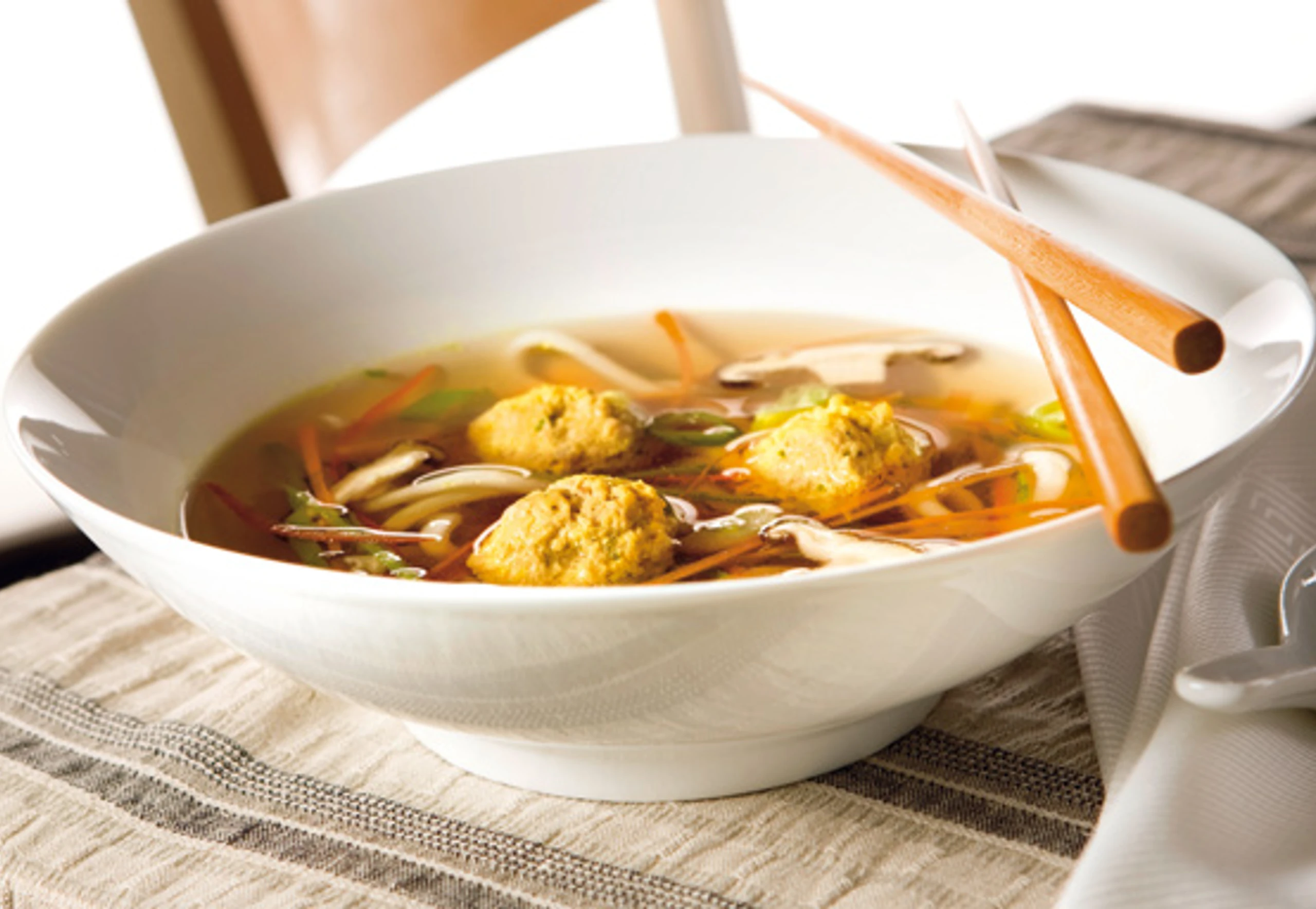 Suppe abseihen. Erbsenschoten und Karotten in feine Streifen, Jungzwiebeln in Ringe, Pilze dünn blättrig schneiden und gemeinsam mit den Udon-Nudeln in der Suppe köcheln. Bällchen einlegen, Suppe servieren.