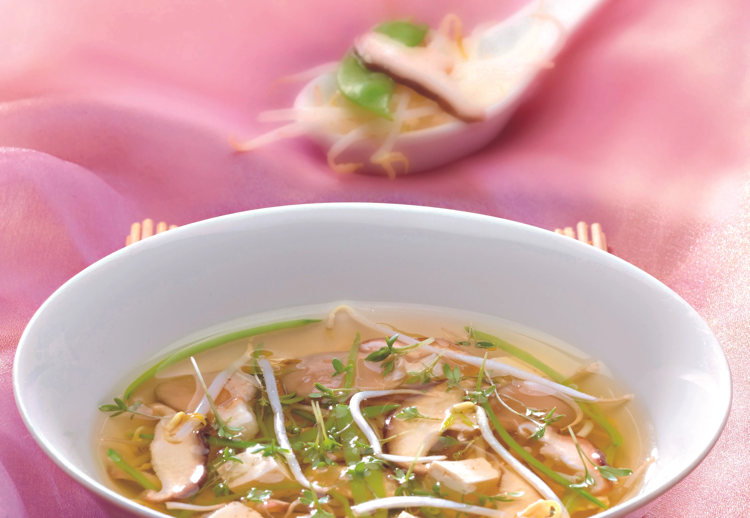 Ca. 1 l Wasser erhitzen, Bio Gemüse Bouillon im Glas und Sojasauce einrühren und aufkochen. Pilze in die Suppe geben und bei schwacher Hitze ca. 3 Minuten köcheln. Sojakeimlinge und Erbsenschoten zugeben und ca. 2 Minuten mitköcheln. Tofu zugeben. Suppe eventuell mit Sojasauce nachwürzen.