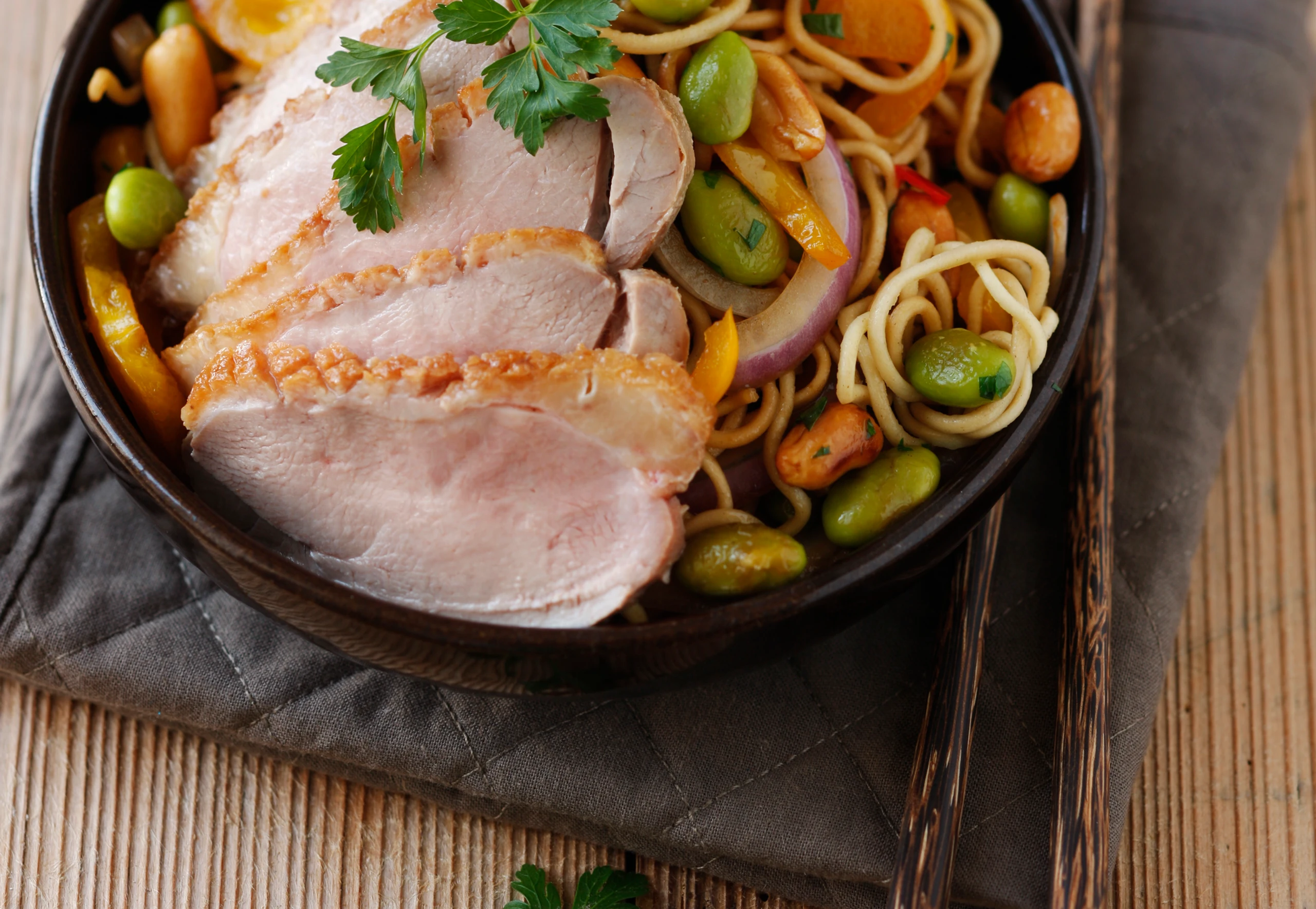 Nüsse, Bohnen, Paprika, Zwiebel und Chili in Öl anbraten, mit Salz, Pfeffer und 6 EL Sojasauce würzen. Nudeln und Petersilie untermischen und kurz ziehen lassen. Entenbrust in Scheiben schneiden und mit den Nudeln anrichten.