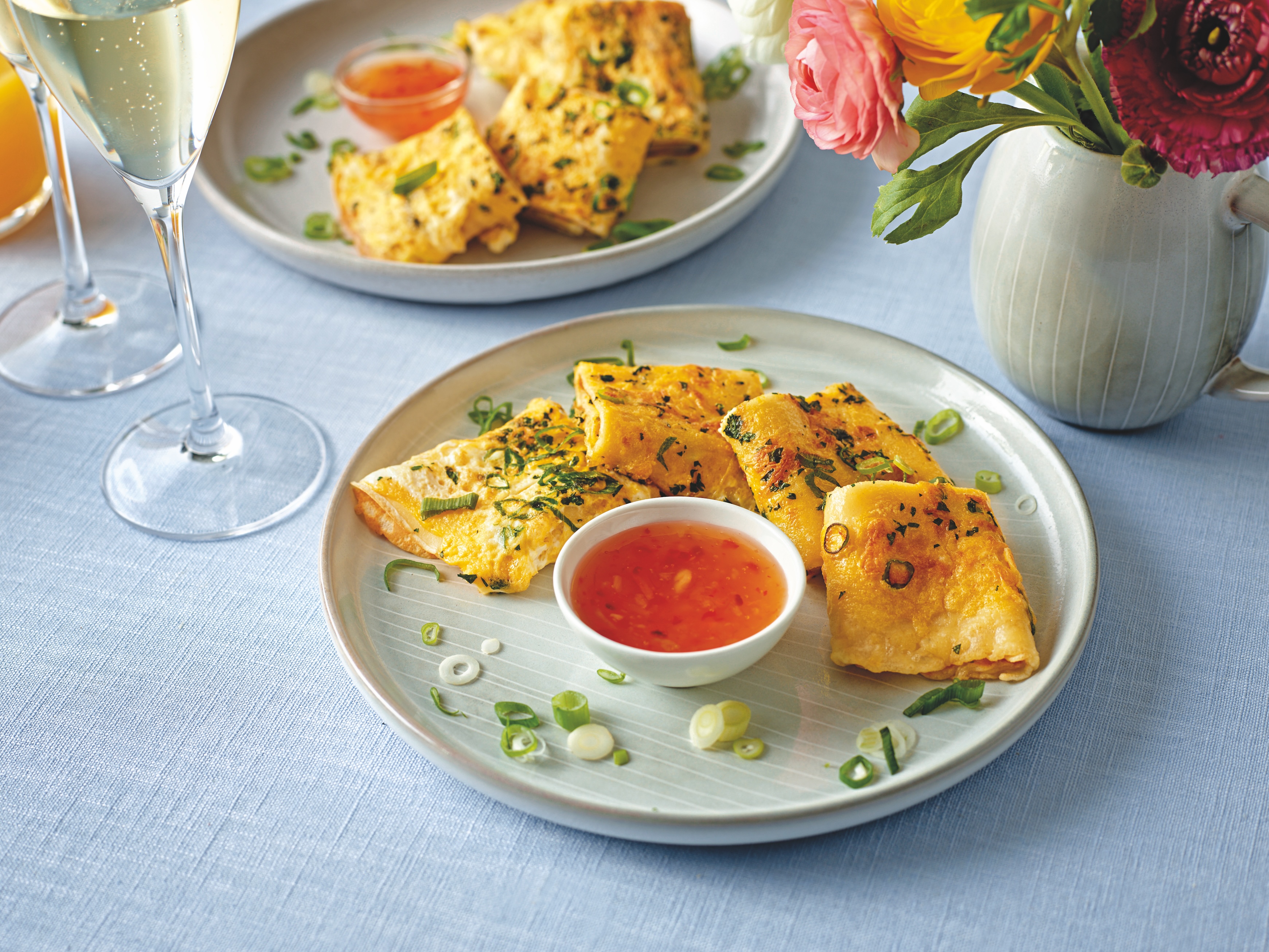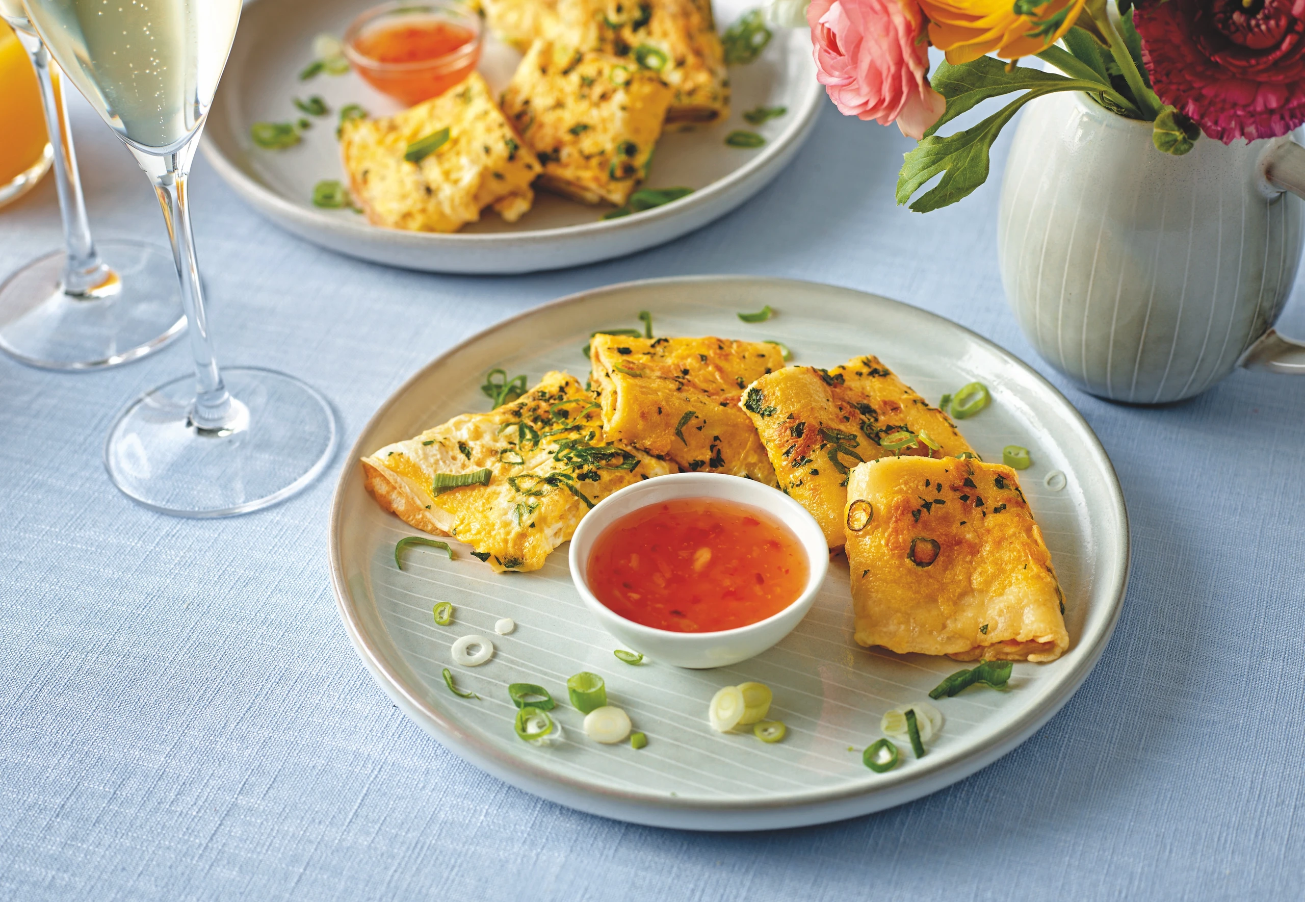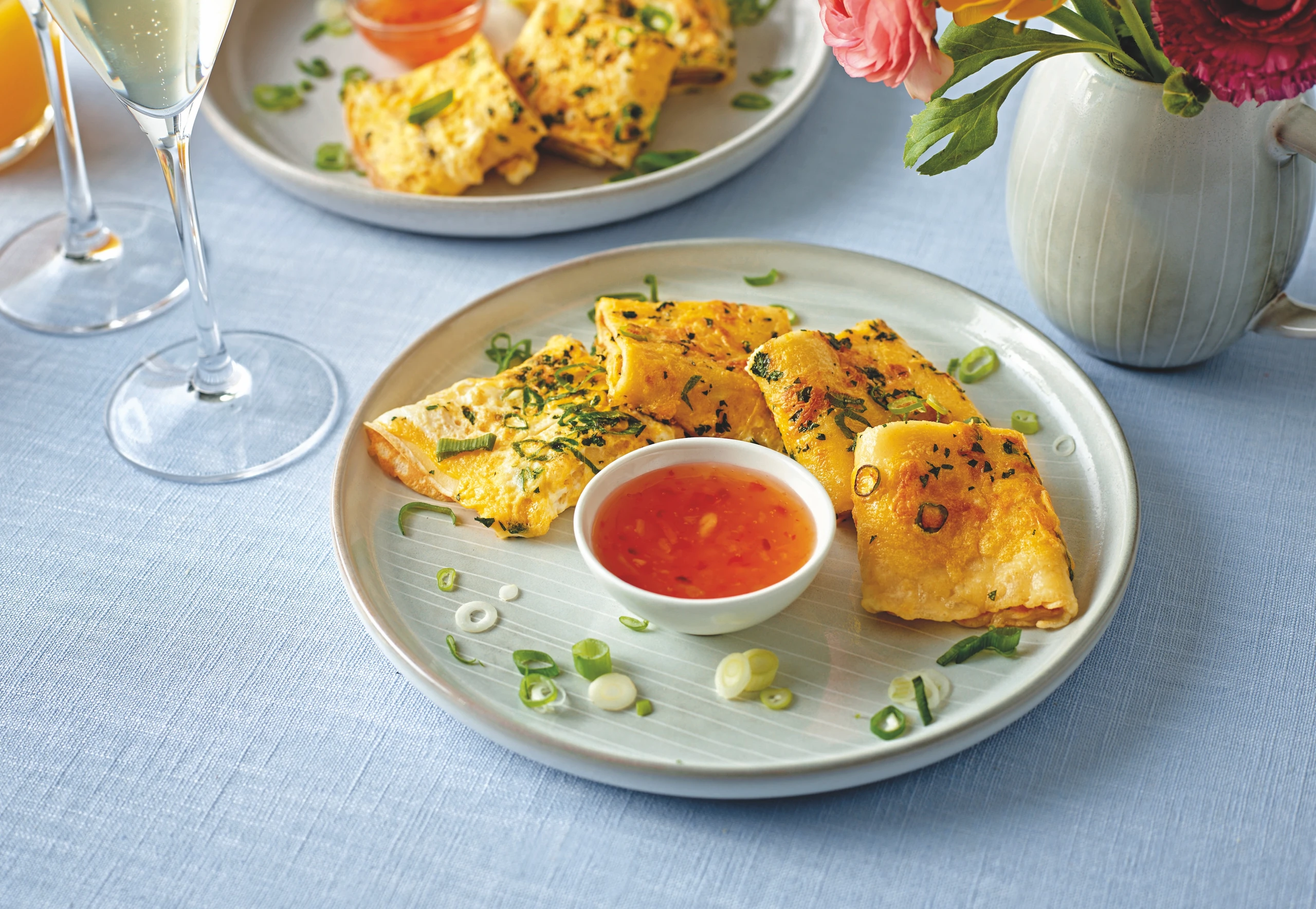 In einer beschichteten Pfanne (Ø 28 cm) etwas Öl bei mittlerer Hitze erwärmen, einen Schöpfer Teig eingießen und gleichmäßig verlaufen lassen. In einer kleinen Schüssel 1 Ei verquirlen, über die Palatschinke gießen und gleichmäßig darauf verteilen, salzen. Etwas Koriander und Jungzwiebeln darüberstreuen. Palatschinke wenden, kurz braten und mit einem Pfannenwender länglich aufrollen, dabei weiter anbraten. Herausheben, warmstellen.