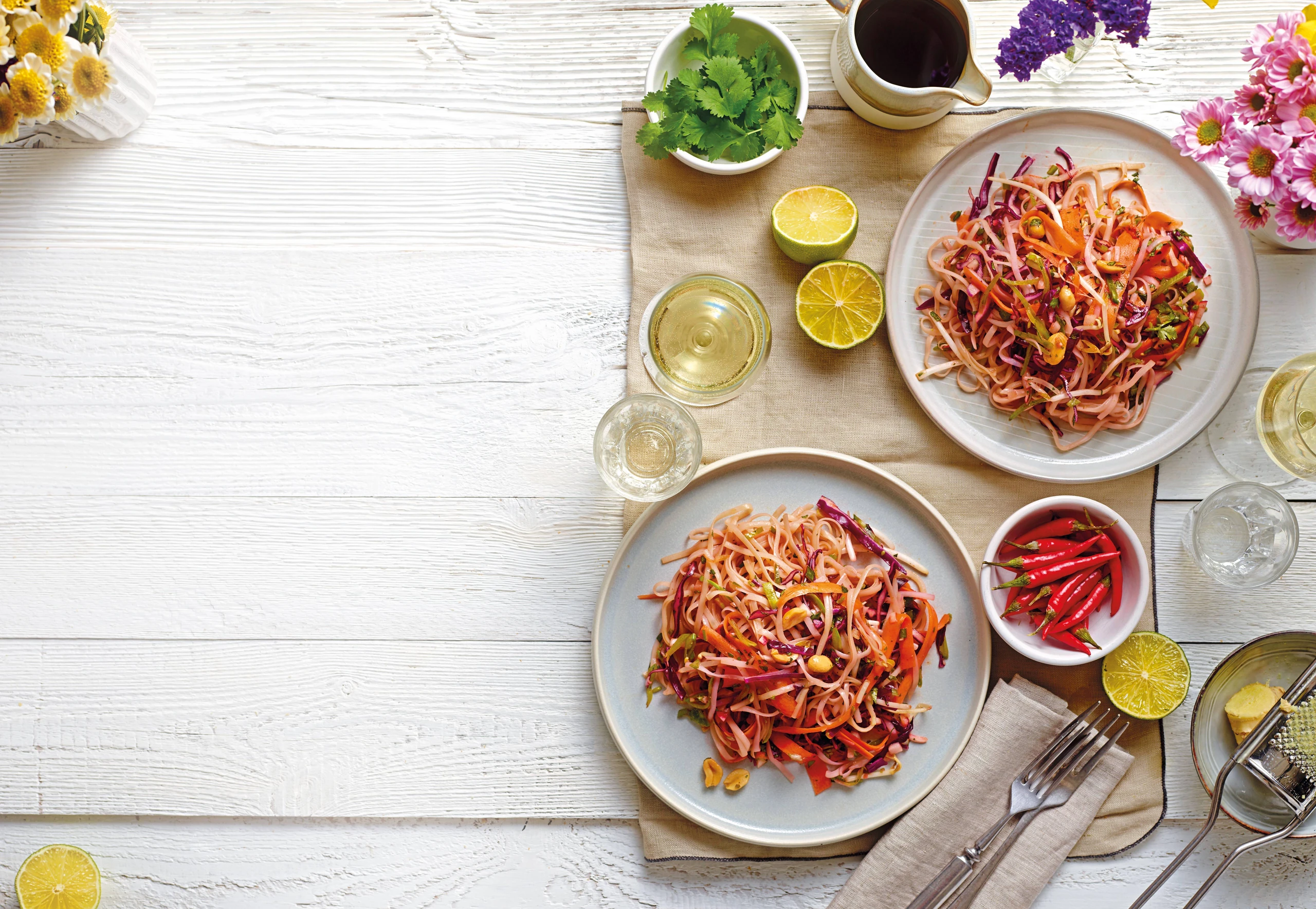 Nudeln ebenfalls in die Salatschüssel geben. Dressing nochmals aufschütteln, über dem Salat verteilen und kräftig durchmischen. Mit Erdnüssen und Kräutern bestreut servieren, extra Limetten dazu reichen.