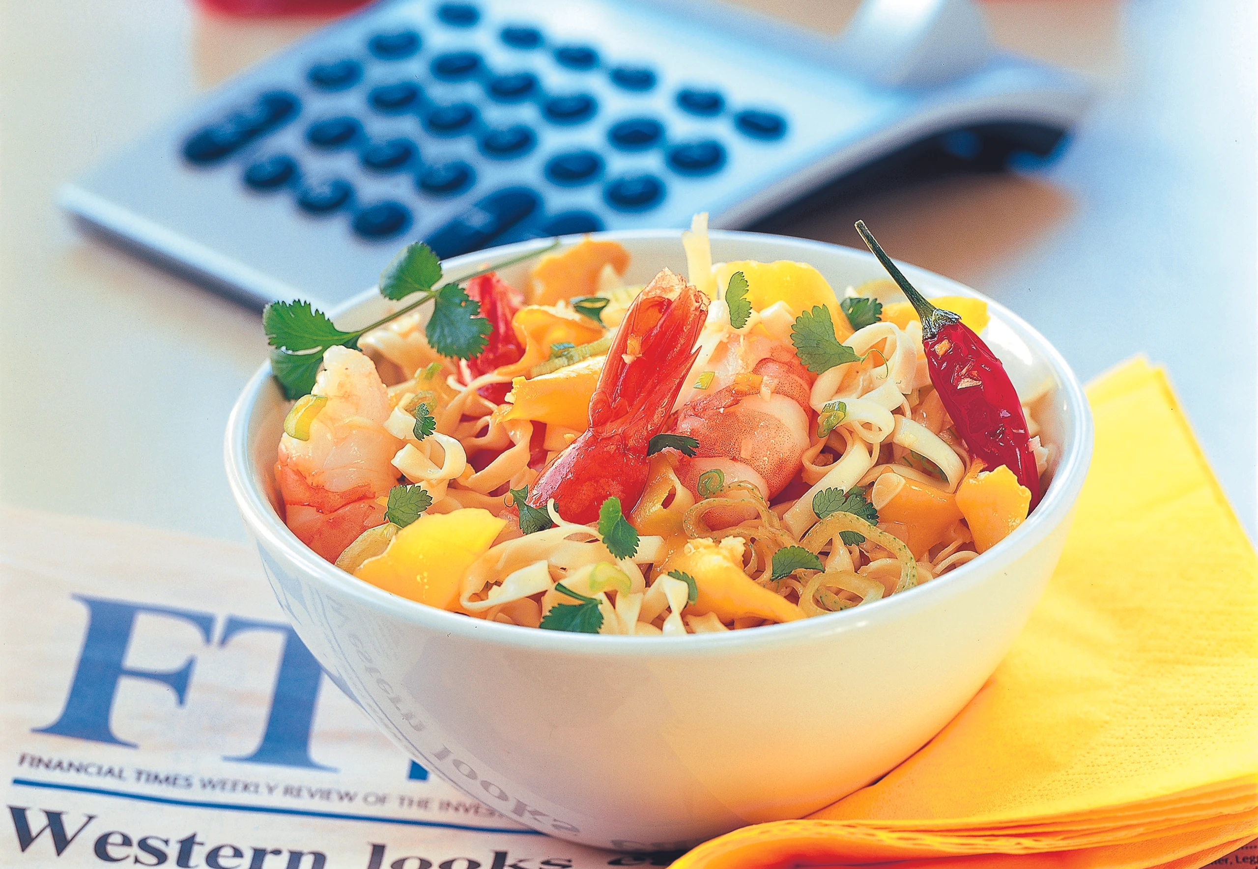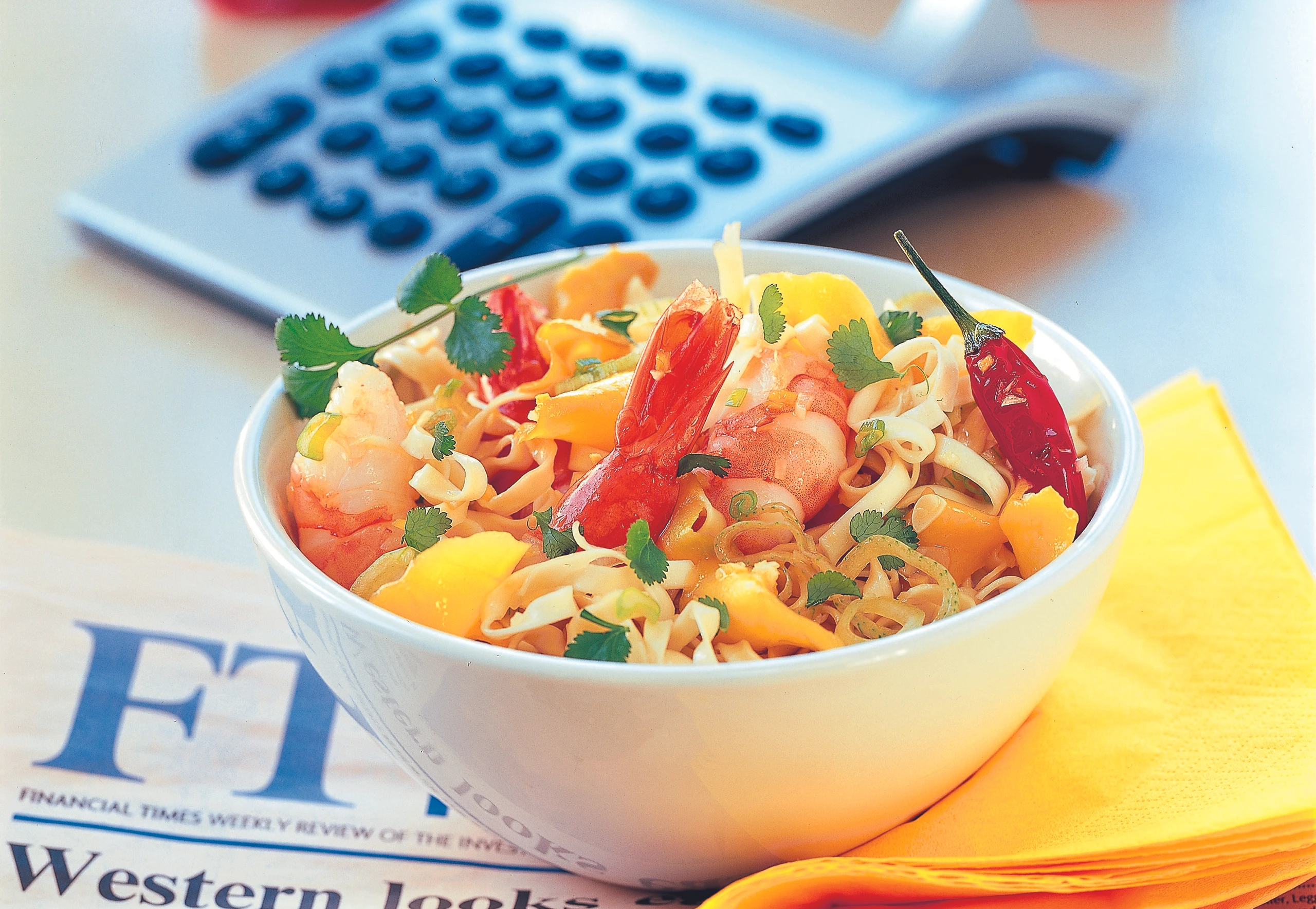 In einem Topf oder Wok Öl erhitzen und die Garnelen zusammen mit Knoblauch, Ingwer, Zitronengras und Chili scharf anschwitzen. Mit der Sauce ablöschen und mit Wasser aufgießen. 10 Minuten leicht köcheln. Mango und Jungzwiebel zugeben. Nudeln zugeben und ziehen lassen, bis sie weich sind. Nudeltopf in Schalen oder Tassen mit reichlich Koriander bestreut servieren.