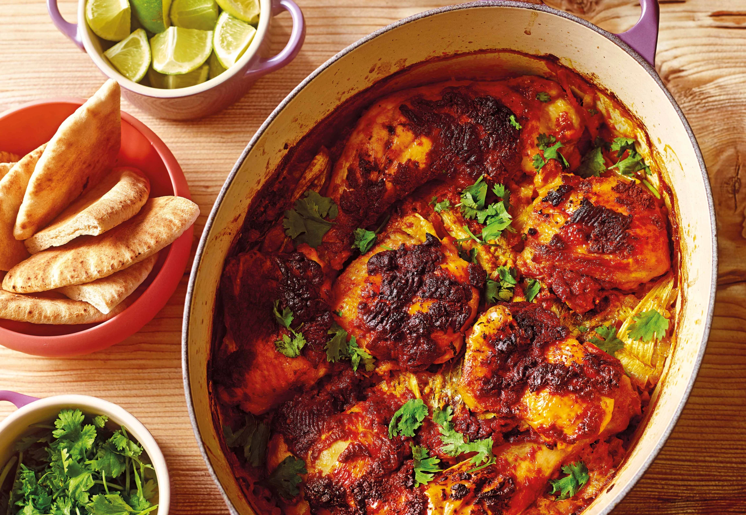 Mit Limettenstücken und Koriander servieren. Wer mag, serviert dazu warme Pitas oder knuspriges Fladenbrot.