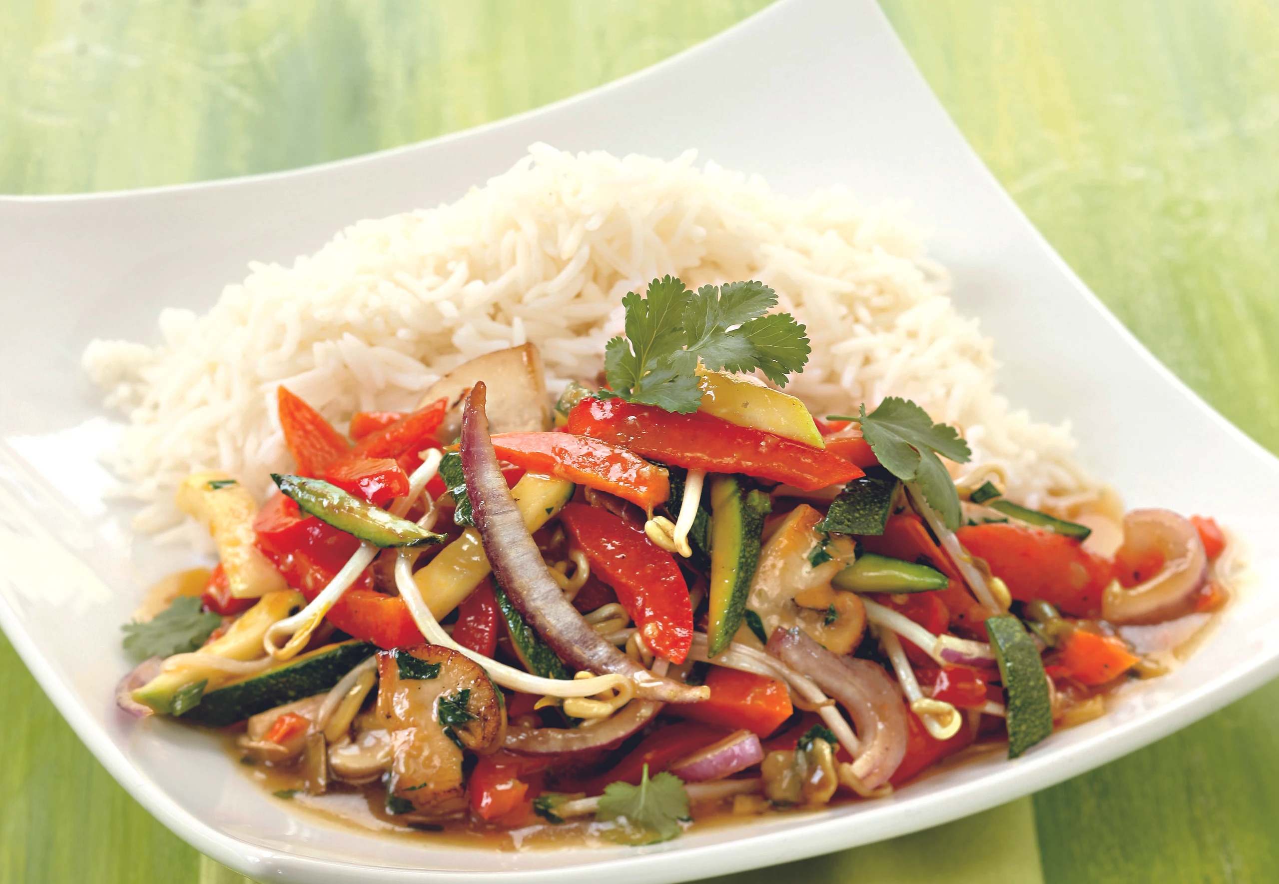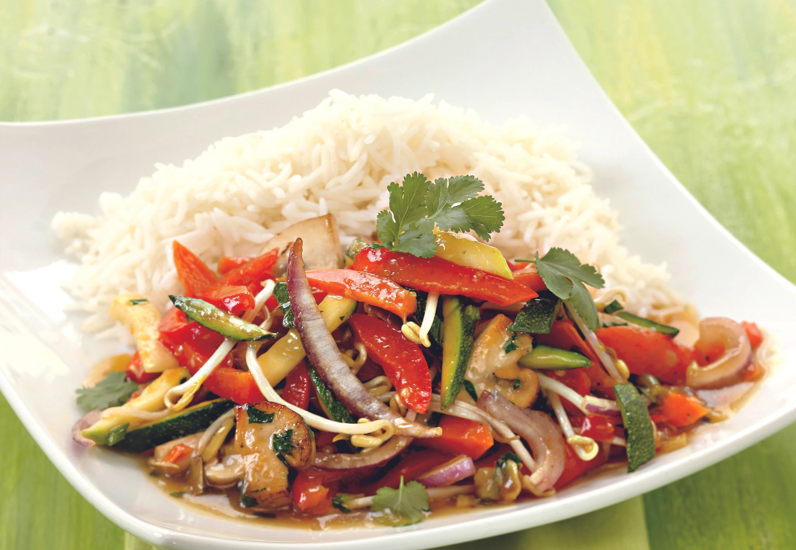 - Gemüse mit Salz, Pfeffer, Ingwer und zerdrückten Knoblauch mischen und 3 Minuten ziehen lassen. Beschichtete Pfanne erhitzen. Öl zugießen und das Gemüse darin 2 Minuten braten – dabei öfter wenden. Keimlinge, Chili und Koriander einrühren. Gemüse aus der Pfanne nehmen.