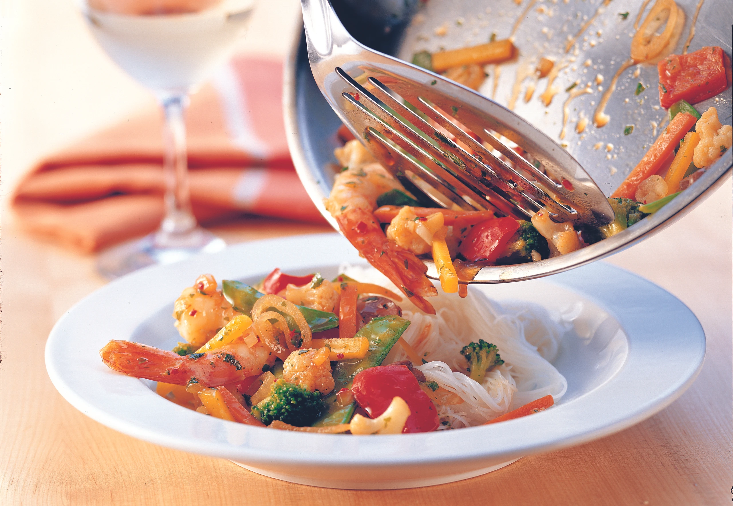 Asiatisches Röstgemüse mit Glasnudeln und Garnelen