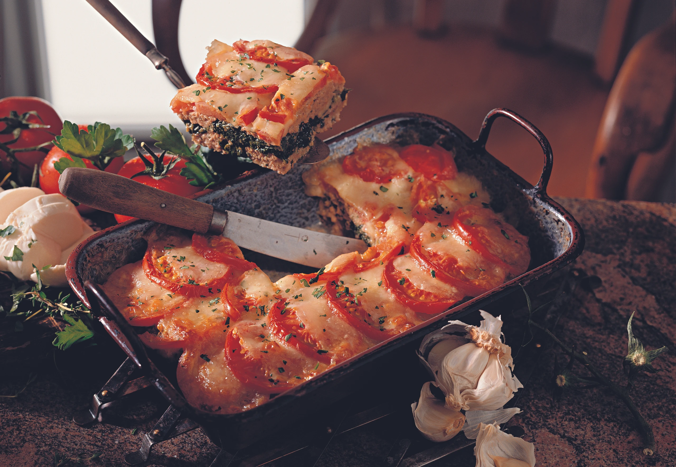 Die Hälfte vom Faschierten in der Auflaufform verteilen, mit Spinat belegen und mit restlichem Faschierten bedecken. Mozzarella- und Paradeiserscheiben á la Caprese abwechselnd auf das Faschierte schichten, mit Petersilie bestreuen.
