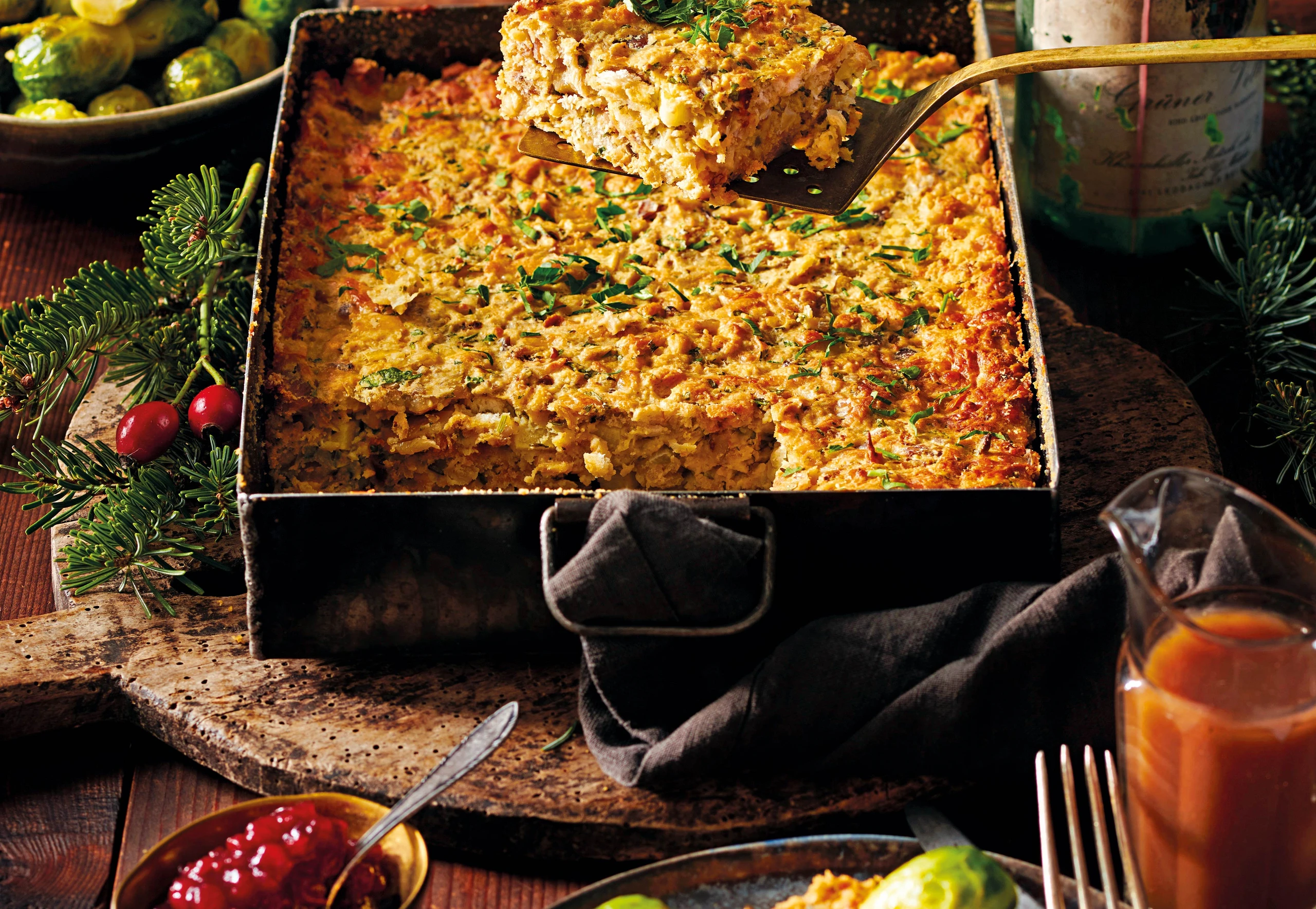 Auflauf mit der Sauce servieren. Dazu passen Preiselbeeren und Kohlsprossen.