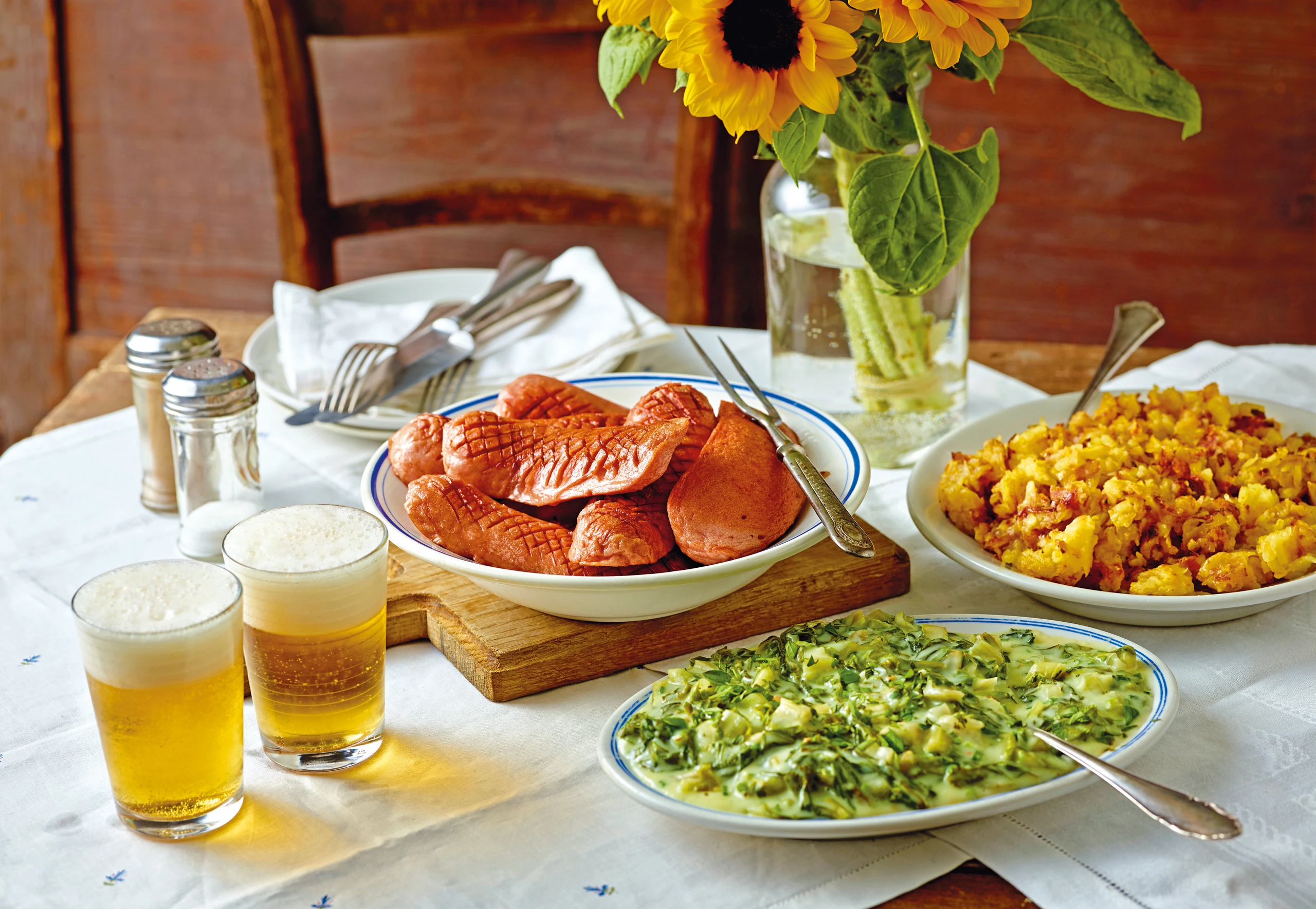 Augsburger mit Erdäpfelschmarren und Kochsalat