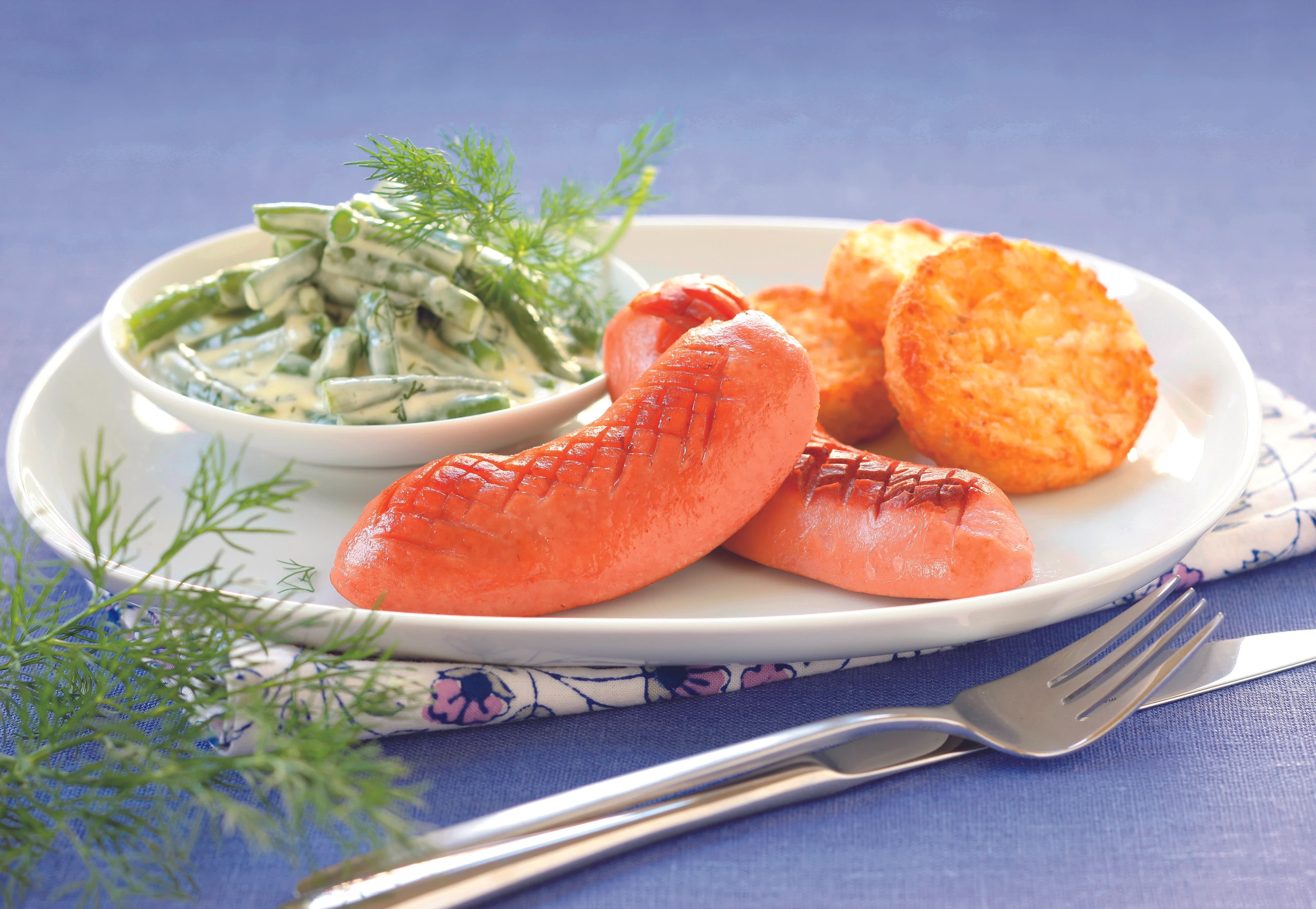 Zwiebel und Knoblauch schälen, klein schneiden und in der Butter anschwitzen. Suppe und Obers zugießen und aufkochen. Fisolen unterrühren und bei schwacher Hitze cremig einkochen. Gemüse salzen und pfeffern, Dille einrühren. Würste mit Fisolen und Rösti anrichten.
