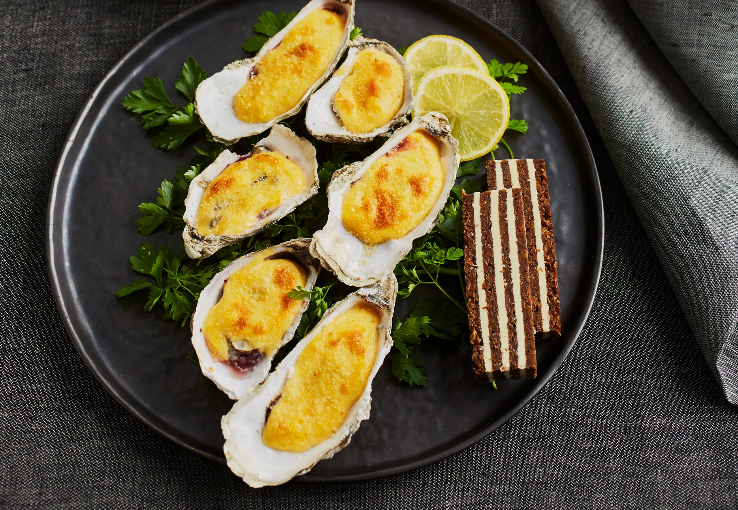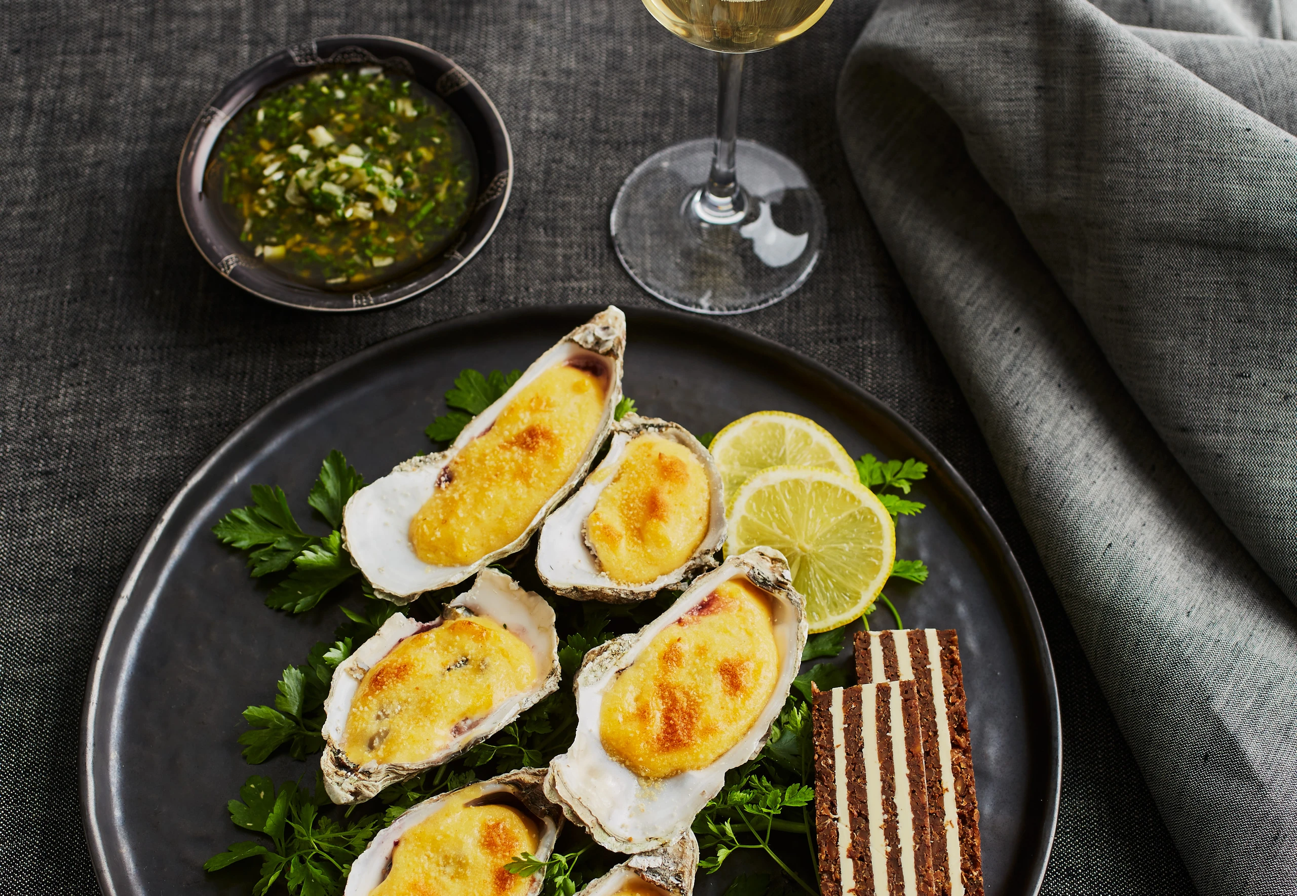 Austernbrot in dünne Scheiben schneiden. Austern aus dem Rohr nehmen und mit Brot und Sherrydressing servieren.