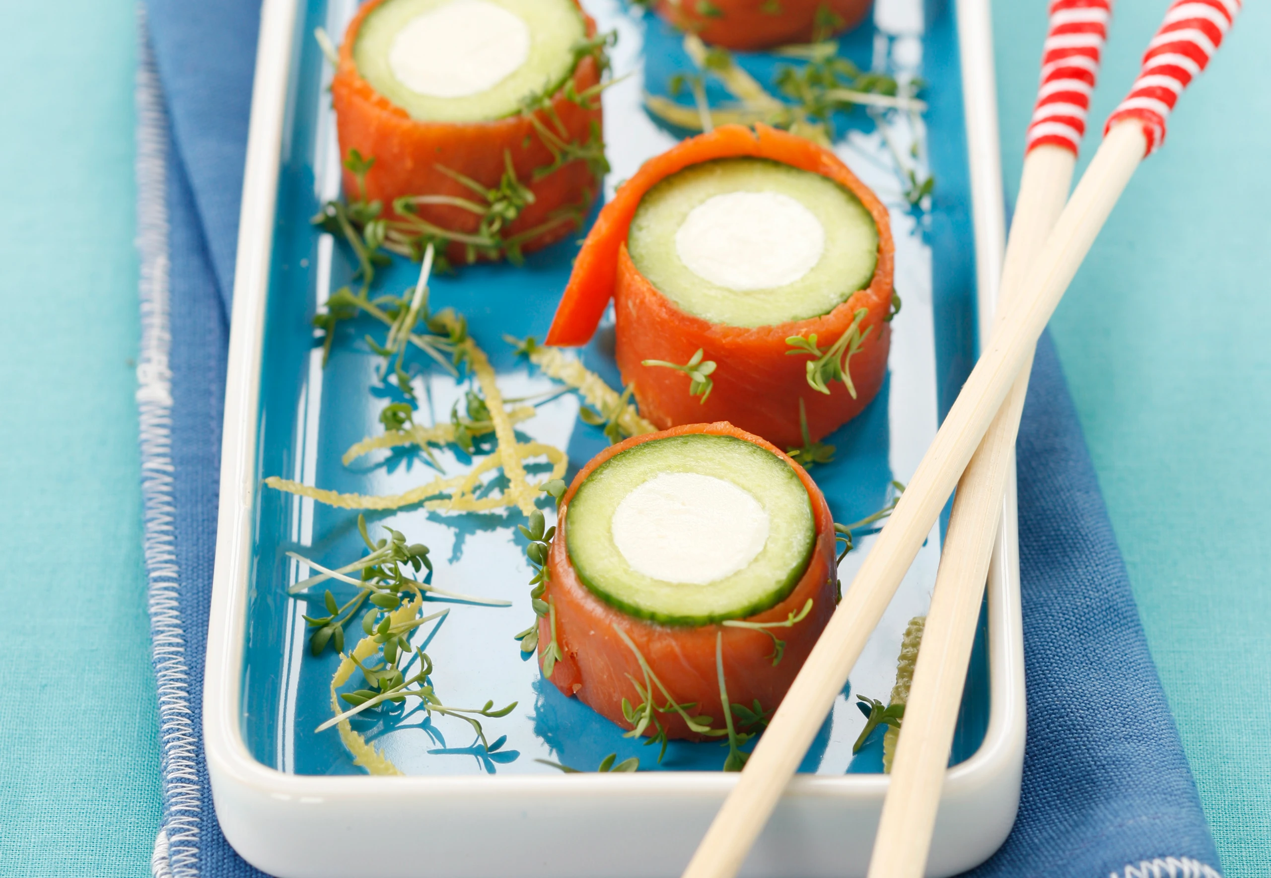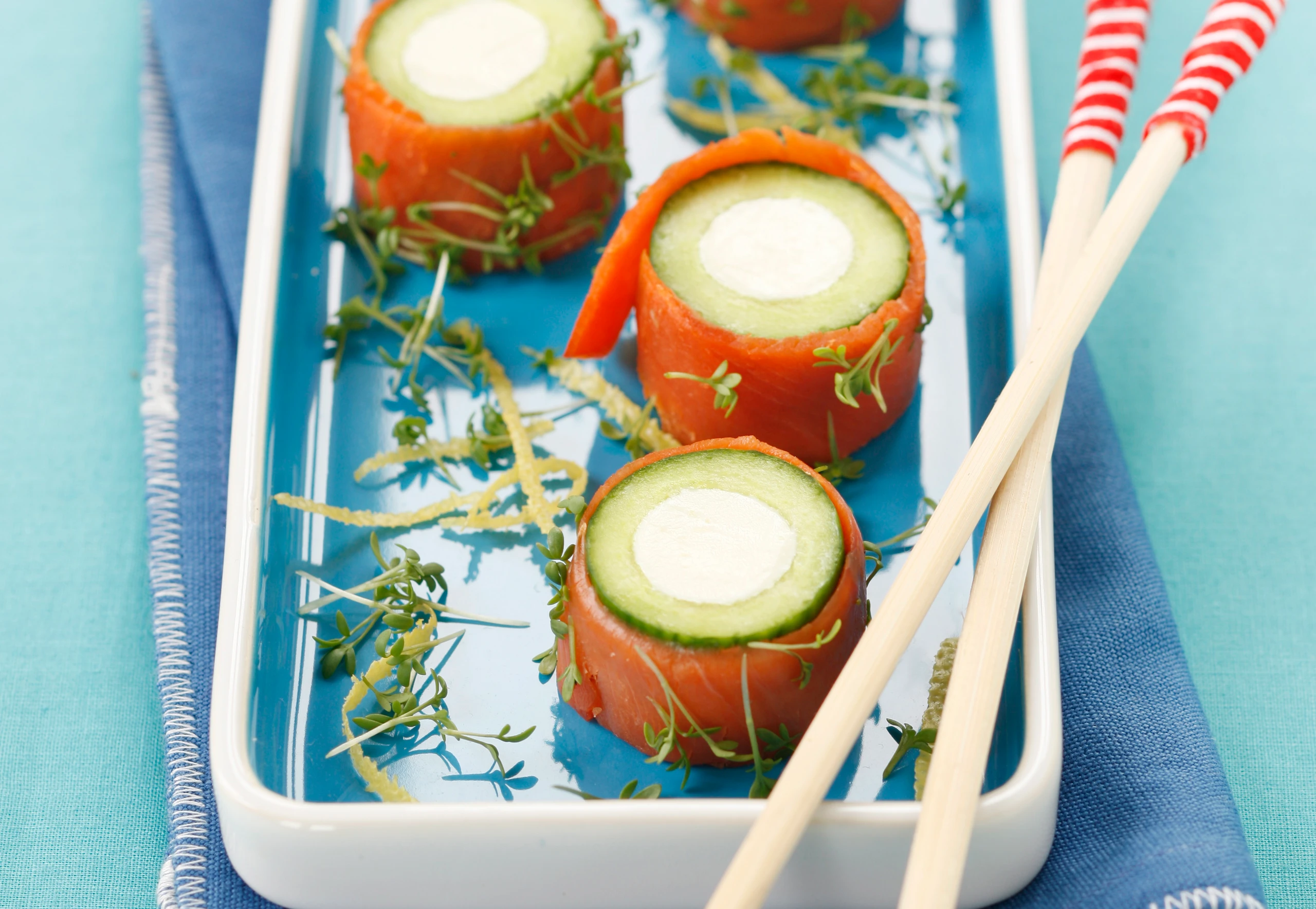 - Lachs in 2 cm breite Streifen schneiden und um die Gurken wickeln. Maki mit Kresse und Zitronenzesten garnieren.