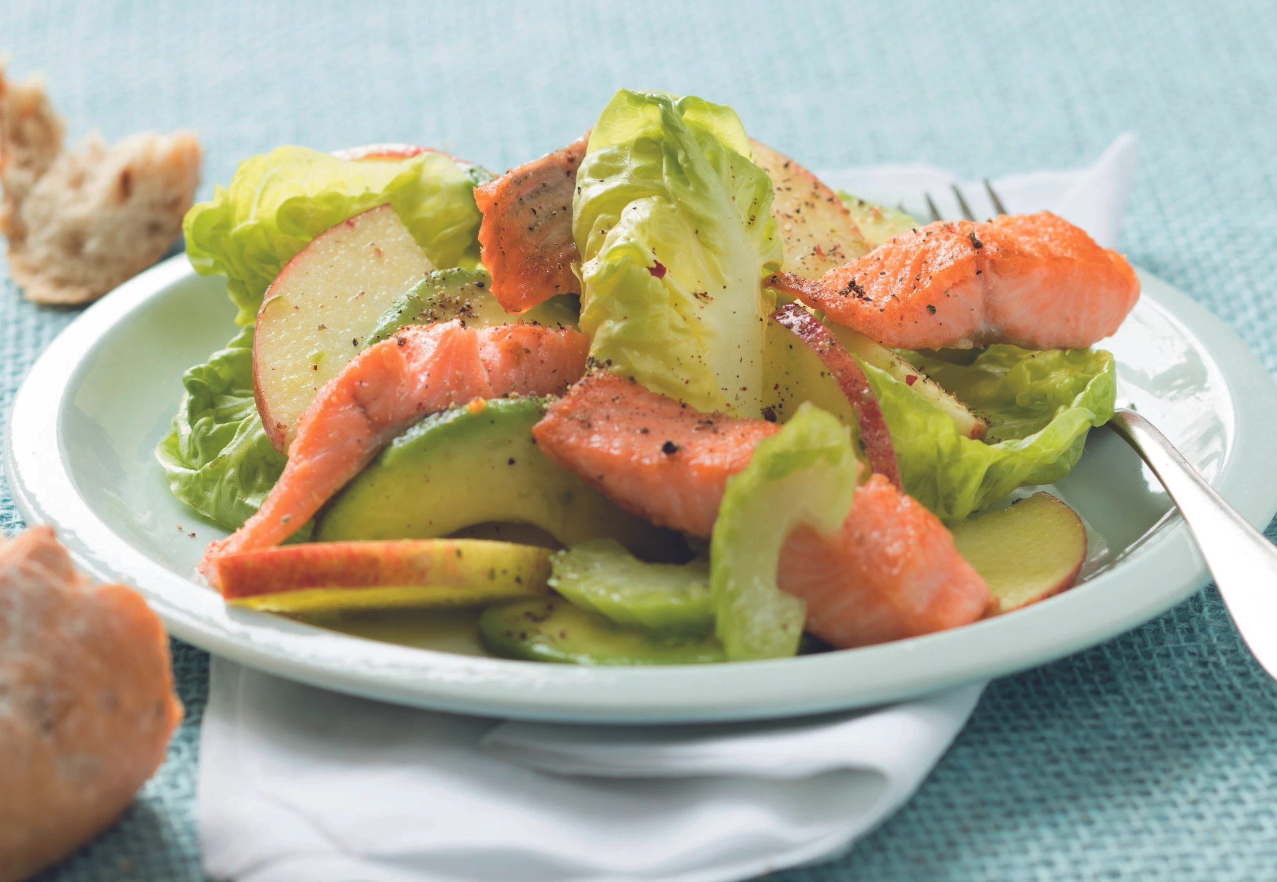 - Für die Marinade Limettensaft mit Honig vermischen, mit Salz und Pfeffer würzen. Öl einrühren. Avocado, Apfel, Sellerie, Selleriegrün und Salatblätter zugeben, behutsam vermischen und kurz ziehen lassen.