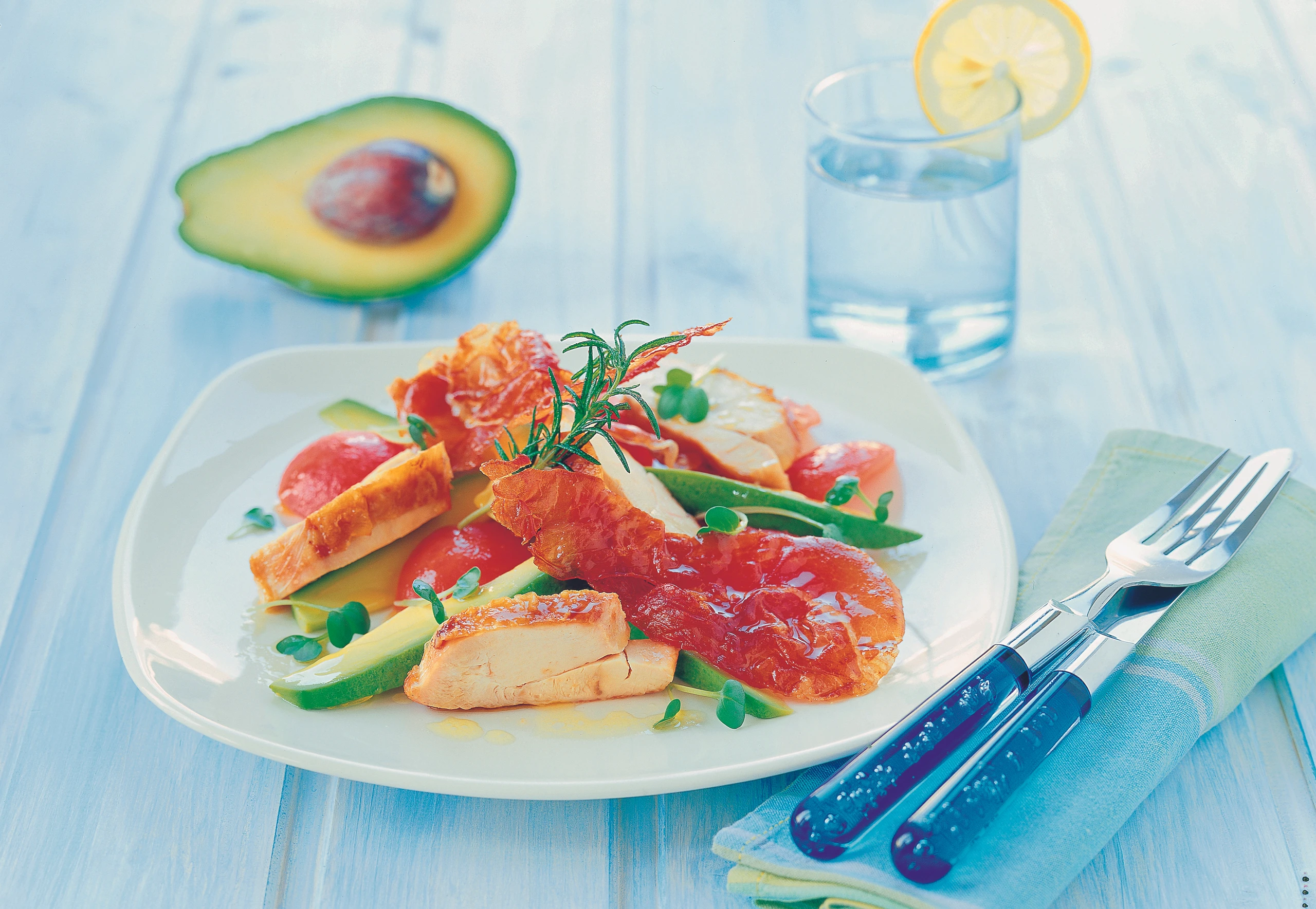 Avocado-Tomatensalat mit Hühnerbrust und Prosciutto