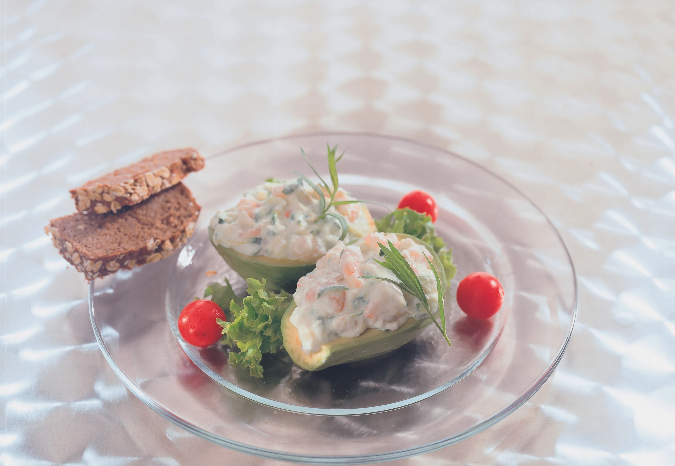 Avocados schälen, rundum bis zum Kern einschneiden und die Hälften abheben. Kerne entfernen, Avocados am Boden ein wenig abflachen, Abschnitte klein schneiden und unter die Fülle mischen. Avocadohälften mit Zitronensaft beträufeln, mit der Zucchini-Shrimpsmischung füllen und mit Estragon garniert servieren. Dazu passen gemischte Blattsalate und Vollkornbrot.