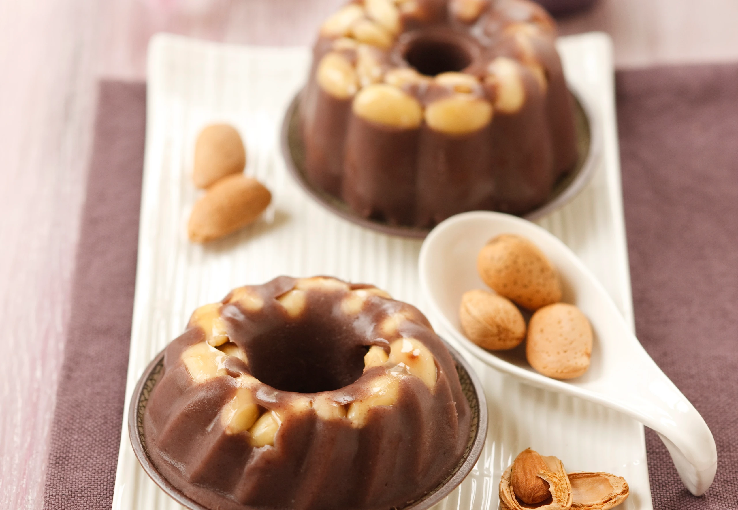 Inzwischen Mandeln in einer trockenen beschichteten Pfanne bei schwacher Hitze rösten und in Puddingformen (je ca. 250 ml Inhalt) füllen, Bohnenpüree darauf verteilen und für 4 Stunden kalt stellen.