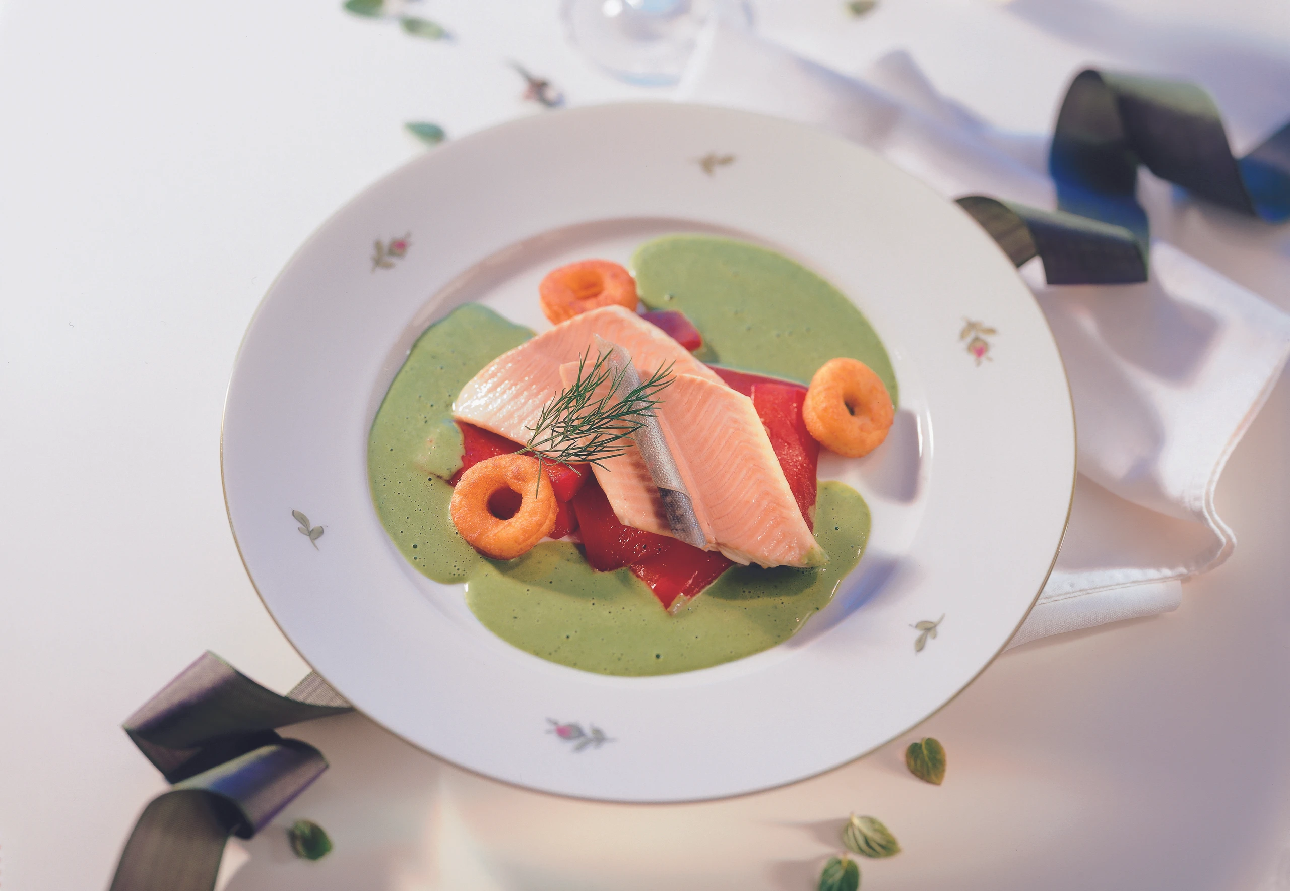 Paprikagemüse auf vorgewärmten Tellern anrichten. Filets mit einem Siebschöpfer aus dem Fond heben, auf Küchenpapier gut abtropfen lassen, auf den Paprikastücken anrichten und mit der Sauce und den Erdäpfelringen servieren.