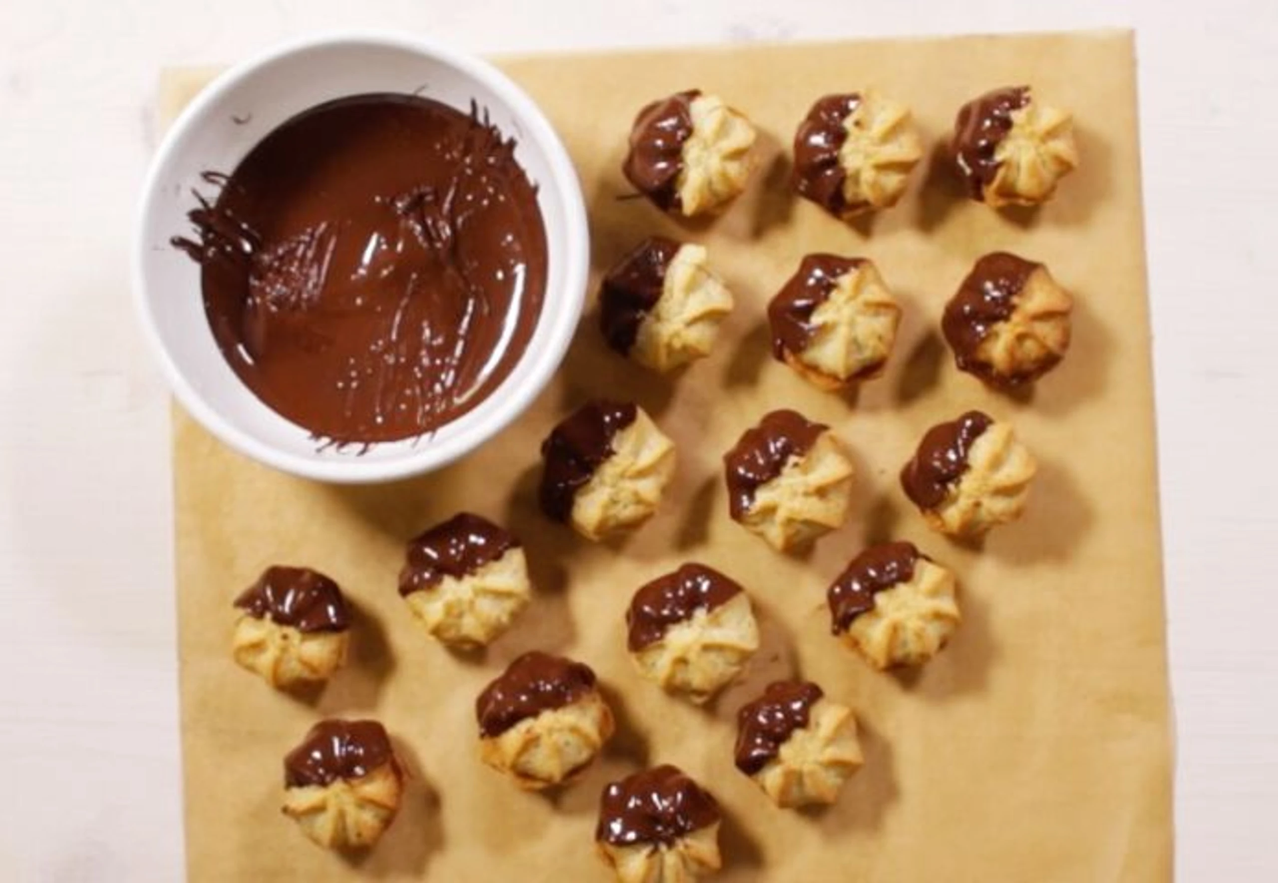- 100 g dunkle Kuvertüre (geschmolzen)