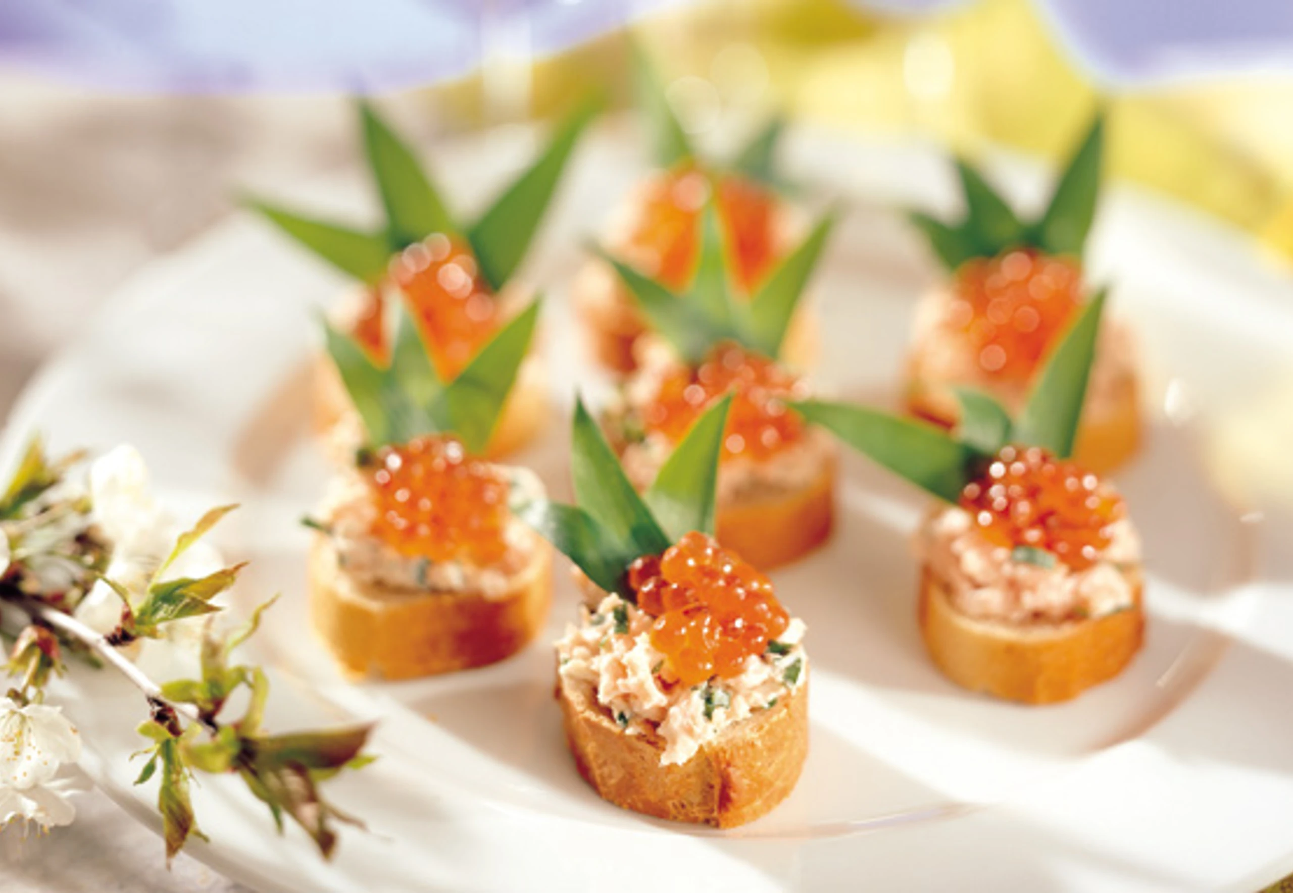 - Brotscheiben mit je 3 Bärlauchblättern belegen (so dass die Blätter auf einer Seite über das Brot ragen), mit der Lachscreme bestreichen und mit Keta-Kaviar garnieren.