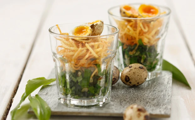 - Bärlauch in Gläser geben, Erdäpfelstreifen salzen und darauf geben. Wachteleier halbieren und oben drauf setzen.