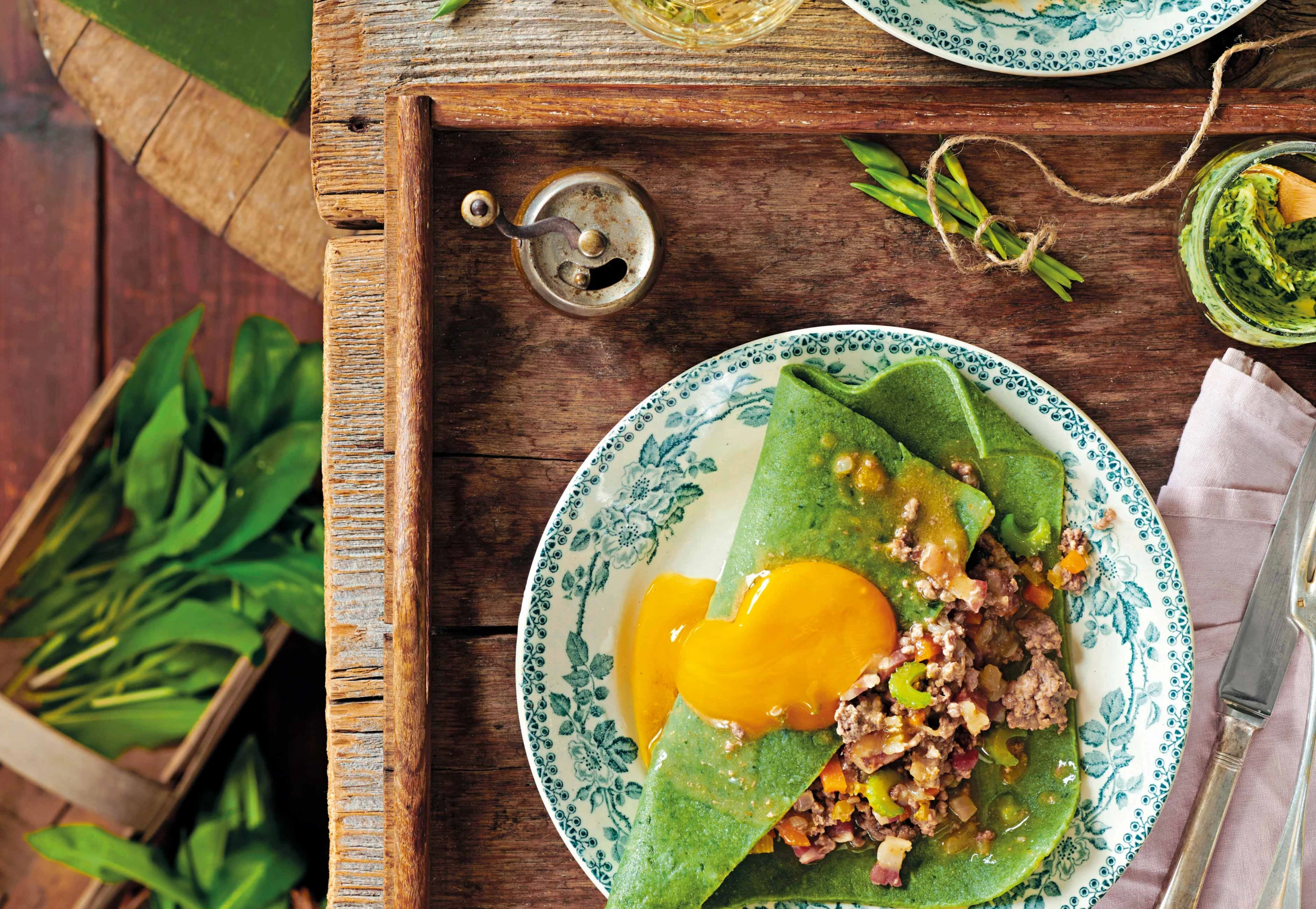 Für den Nudelteig 2 l Salzwasser aufkochen. Bärlauch zugeben und ca. 15 Sekunden blanchieren. In einem Sieb mit eiskaltem Wasser abschrecken. Bärlauch fest ausdrücken. Mit Olivenöl und Dottern fein pürieren. Hartweizenmehl zugeben, alles zu einem glatten Teig verkneten. Ist der Teig zu trocken, etwas Wasser einarbeiten. Ist er zu klebrig, mehr Mehl einarbeiten. Teig zugedeckt ca. 1 Stunde rasten lassen.