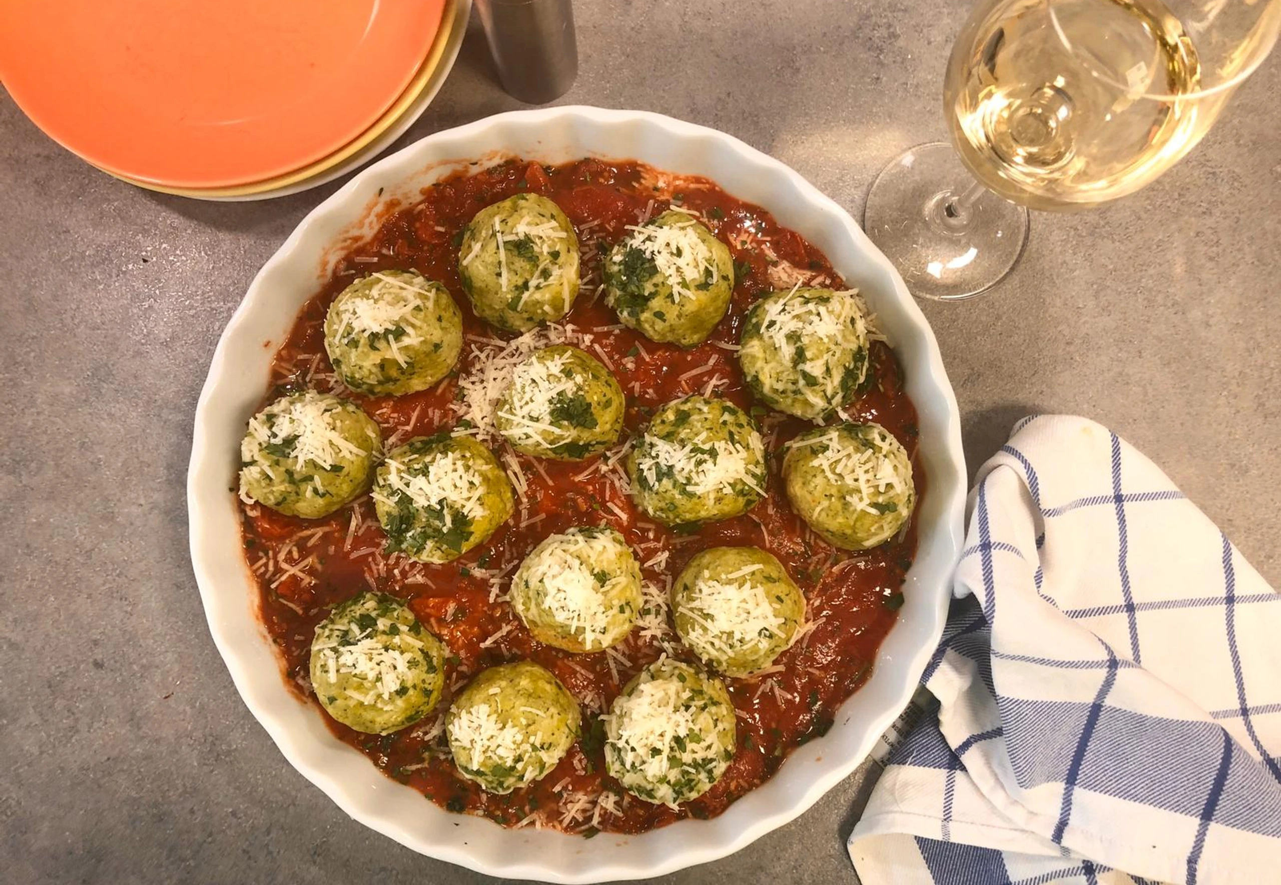 Paradeiser aus dem Rohr nehmen. Knödel darauf anrichten und mit Parmesan und Petersilie bestreut servieren.